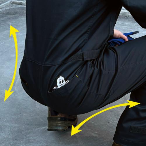 ストレッチ素材で動きやすく、座ってもつっぱりにくい。