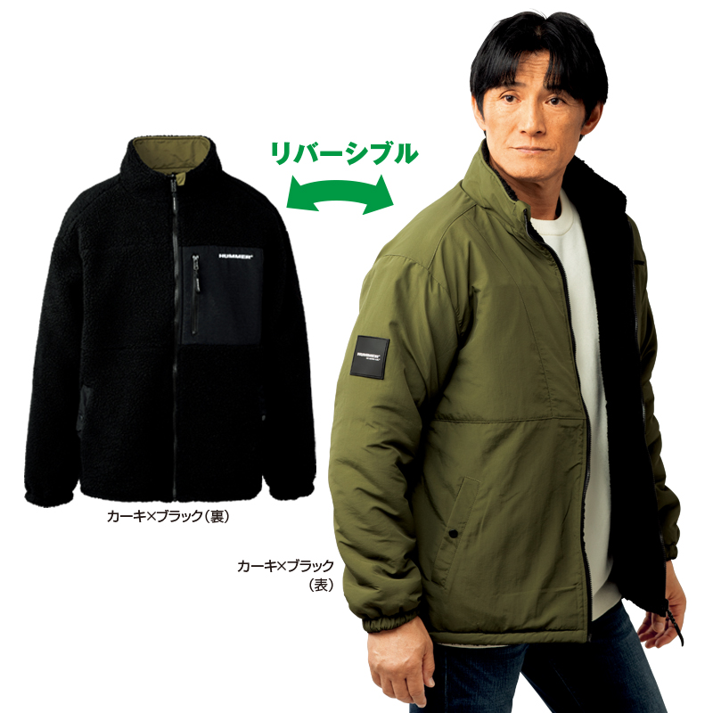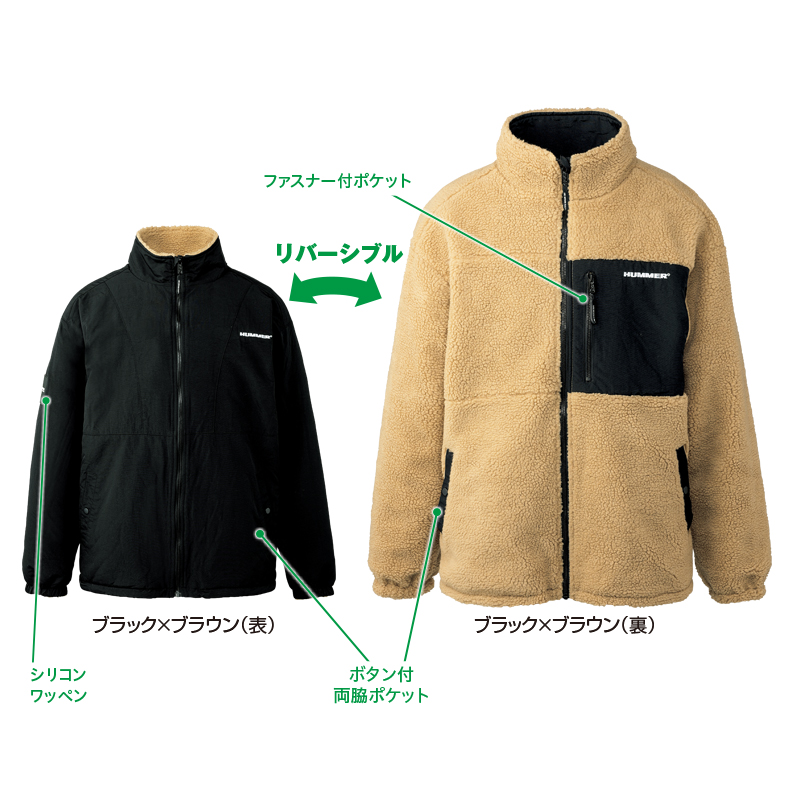 フィールドを走破する<ハマー>を着こなす。 強靭で機動的なHUMMERの車体がモチーフ。軽量で耐久性があるナイロン素材と、保温性のあるフリース素材がリバーシブルで着分けられます。 ●重量(約):780g(L) ●素材:表地=ナイロン100%(撥水加工)/裏地=ポリエステル100% ●仕様:表側=両脇ボタン付ポケット/裏側=両脇ボタン付ポケット、左胸ファスナーポケット ●手洗い可 ●ミャンマー製