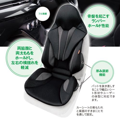 クッションをセットするだけでバケットシートに変身! シートにセットすればバケットシートの座り心地を実現。体をしっかりホールドし、厚み調整機能で幅広いシート形状やユーザーの体型に対応。運転時の疲れを軽減します。 ●カラー:ブラック×グレー ●サイズ(組立時・約):頭部=縦63×横52×厚さ4cm/背面部=縦55×横53×厚さ10cm/座面部=縦47×横58×厚さ10cm ●重量(約):1.6kg ●材質:側生地=ポリエステル/中材=ポリウレタン ●日本製 ※リクライニングができないシートや差し込み固定ができないシートには使用できません。