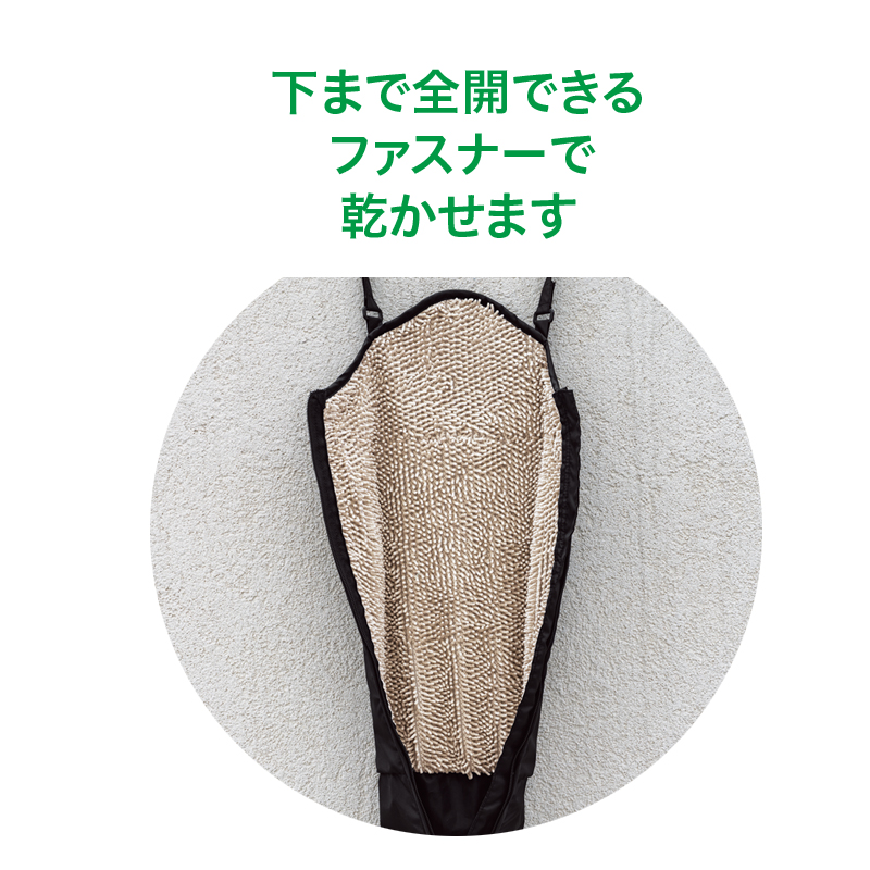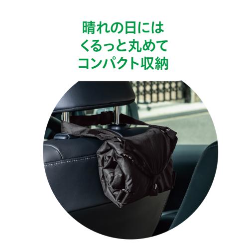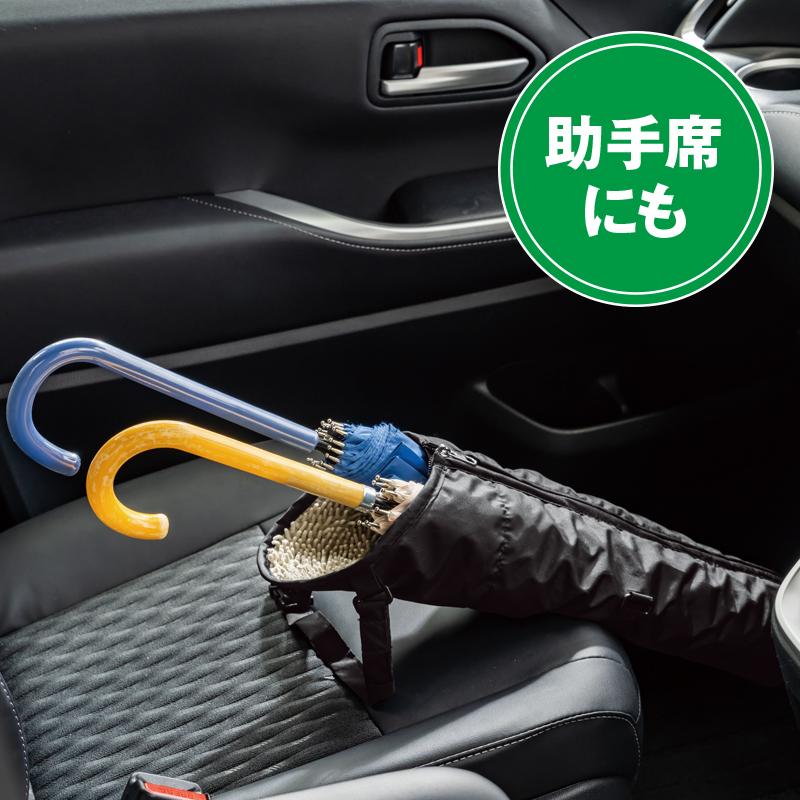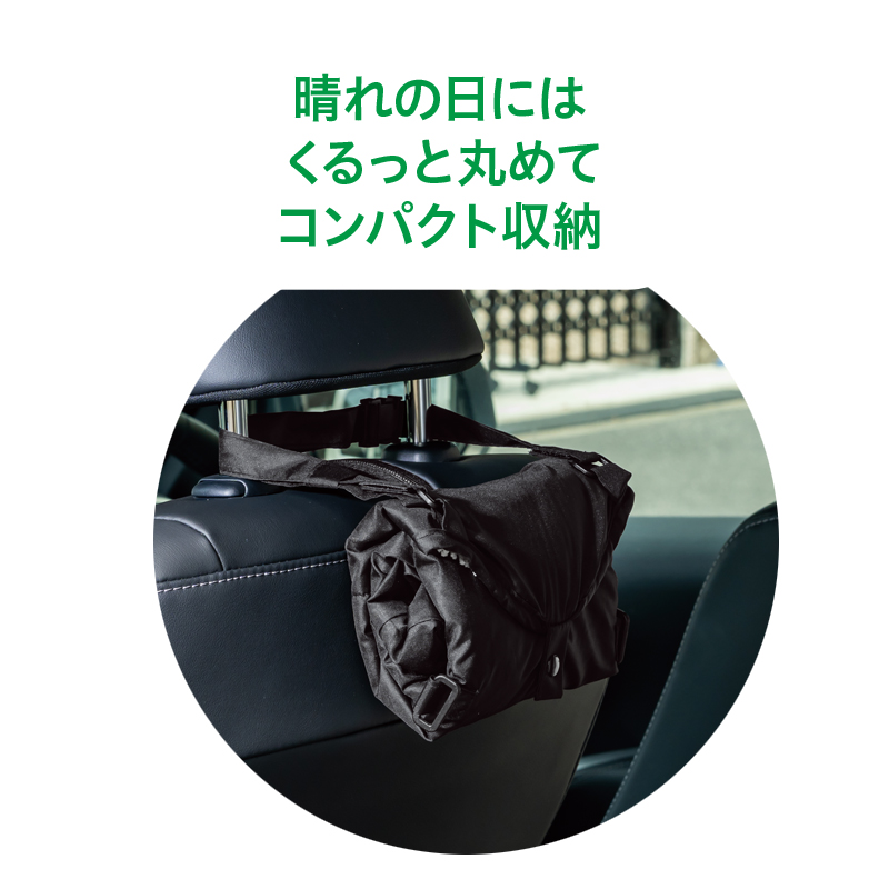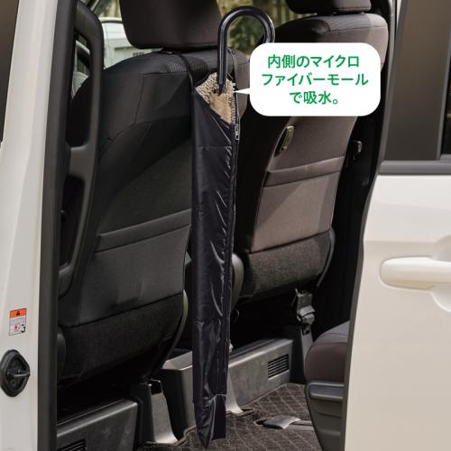 濡れた傘を吸水しながら車内にスマート収納。 濡れた傘をすっぽり収納するから車内が濡れず、しかも同時に吸水するので、次に使う時も快適です。ヘッドレストに簡単に取り付けられ、たたんでコンパクトに保管もできます。 ●カラー:ブラック ●サイズ(約):使用時=幅17.5×長さ73.5×厚さ1.5cm/収納時=幅18×高さ11.5×厚さ9cm/持ち手高さ=最長21cm ●重量(1個・約):128g ●材質:ポリエステル100%(撥水加工) ●収納可能サイズ:親骨の長さ50~65cmまでの長傘を最大2本 ●洗濯機可(ネット使用) ●中国製 ※ご使用後の返品・交換はお受けできません。