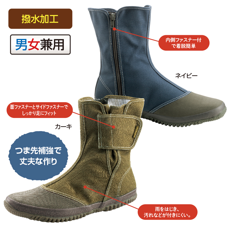 脱ぎ履き簡単。疲れにくく安全な作業シューズ。 柔らかく厚みがある素材が足への負担を軽減し、しゃがんだ姿勢での作業も楽々。滑りにくいゴム底で、デコボコ路面もラクに歩けます。抗菌防臭加工の中底で、足の汚れや臭いも安心。 ●ワイズ:3E ●重量(約):330g(L・片足) ●材質:アッパー=綿(帆布)/ソール=ゴム ●中国製