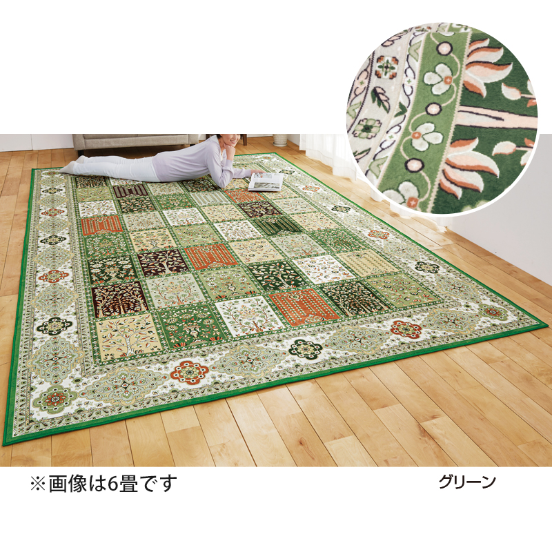 お部屋をペルシャ調の鮮やかな柄が彩ります。 ペルシャ絨毯のような柄を多彩に配した鮮やかな彩りは季節を問わず一年中使えます。撥水加工で汚れに強く、サッと拭くだけとお手入れ簡単。つまずきにくく、収納しやすい薄手です。 ●サイズ(約):縦190×横190×厚さ0.7cm ●重量(約):3.7kg ●材質:表側=ポリエステル100%(撥水加工)/裏側=ポリエステル100%(滑りにくい加工) ●洗濯機可 ●中国製 ※商品の性格上、一点一点柄の出方が異なります。