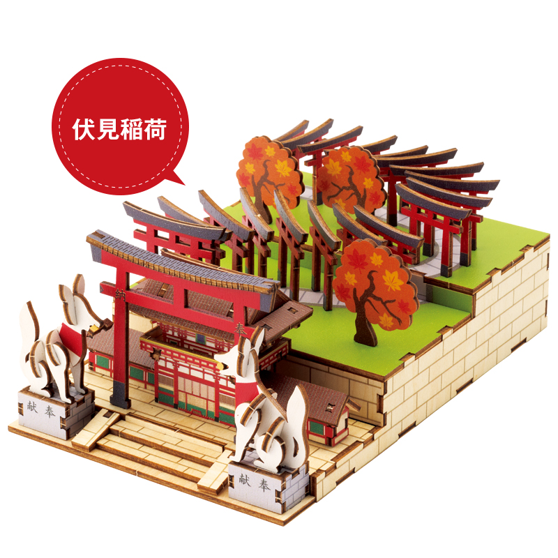 工具も接着剤も不要。作り終えたら飾れます。 精密にレーザーカットされた木製パーツを組み立てるだけ。外国人観光客の人気トップ3にも入る名所の「伏見稲荷」。 ●サイズ(完成時・約):幅10×奥行15×高さ6.2cm ●重量(完成時・約):59g ●材質:シナ合板 ●パーツ数:96 ●組立式(組立参考時間=1~3時間) ●対象年齢:15歳以上 ●中国製 ※製作開始後の返品・交換はお受けできません。