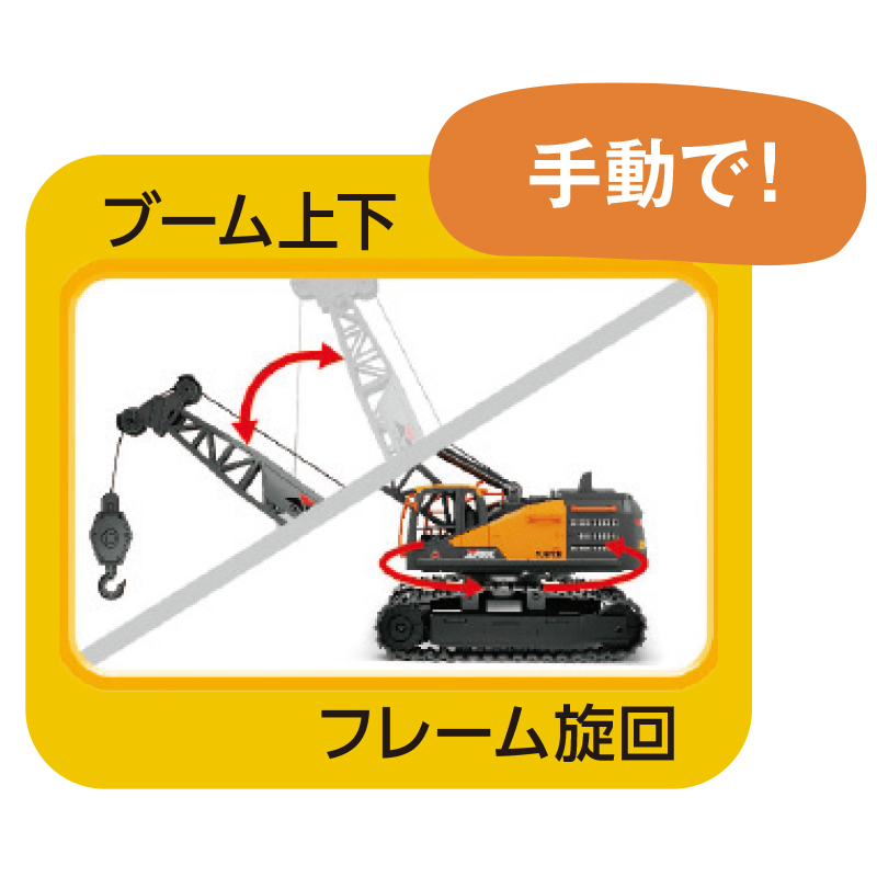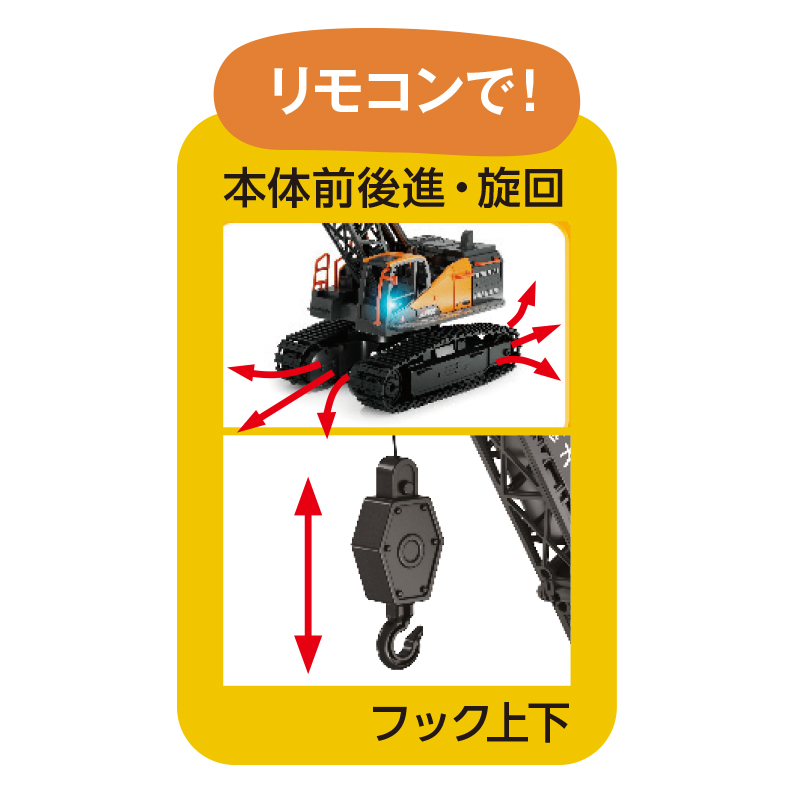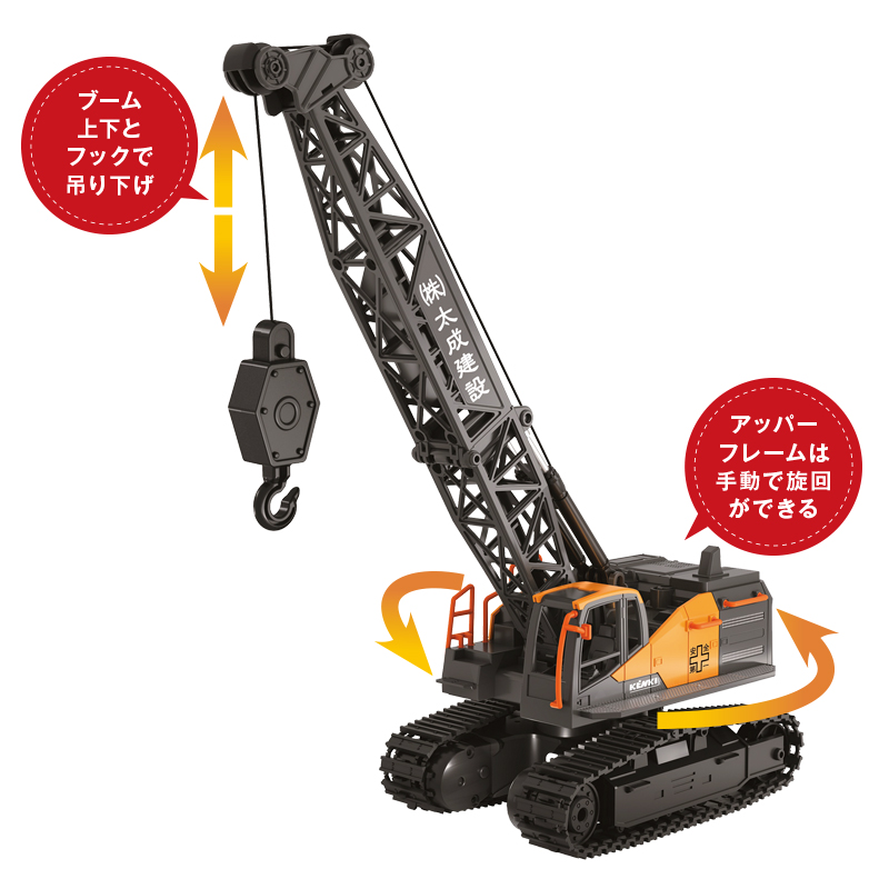 工事現場で重機を操縦する夢が叶う。 最大全高約30cmの大型クレーンが目を惹く重機模型。無限軌道(クローラー)により、走破性に優れ、小回りも利きます。コントローラーで本体の前後進や旋回が可能。また、フックを上下させて小物を吊り下げることも可能です。 ●サイズ(約):全長19.7×全幅9.7×全高30.6cm/ブームを倒した時=全長29.7×全幅9.7×全高25cm ●重量(本体・約):390g(充電池含む) ●材質:ABS樹脂、他 ●電源:本体=リチウムイオン充電池(3.7V/500mAh)×1(USB充電・充電時は本体から取外し)/送信機=単3形アルカリ乾電池×2(別) ●本体充電時間(約):90~120分 ●連続使用時間(約):本体=15~20分 ●操作可能範囲(約):8m ●セット内容:本体、送信機、リチウムイオン充電池、USB充電ケーブル ●対象年齢:10歳以上 ●中国製 ※通電後の返品・交換はお受けできません。