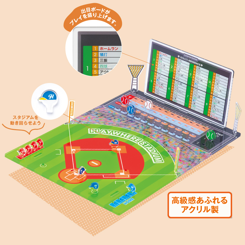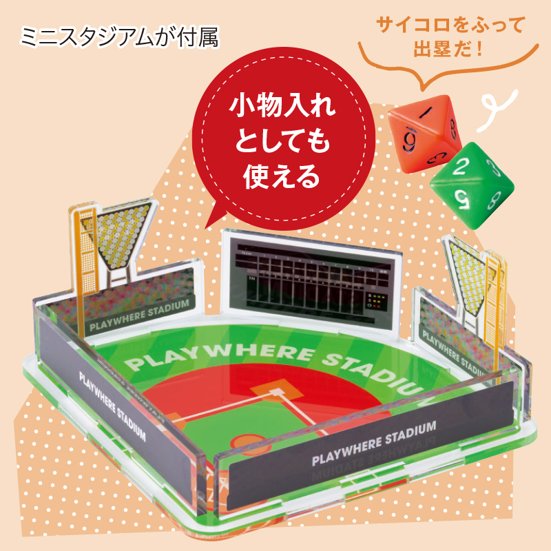 少年時代の興奮をもう一度。白熱する野球ボードゲーム。 赤・青の2チームに分かれ、8面サイコロ2個を振って出た数字を基に、ヒットやホームラン、アウトを決め、9回まで戦います。2人からでも遊べるので、友人や家族と盛り上がれます。 ●サイズ(約):スタジアム=幅25.8×奥行36.5×高さ12.4cm/ミニスタジアム=幅12×奥行16×高さ5.2cm ●総重量(約):スタジアム=700g/ミニスタジアム=80g ●材質:アクリル樹脂、他 ●セット内容:スタジアム(本体、走者・打者コマ×8、ボール×4、照明、ファウルポール)、ミニスタジアム(本体、照明&ファウルポール、スコアボード、観客スタンド、フェンス)、出目ボード、サイコロ×2 ●日本製