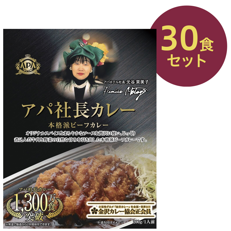 深いコクと旨み。手間ひまかかる専門店の味を手軽にご自宅で。 アパホテル社長が自信を持っておすすめする本格ビーフカレーです。オリジナルスパイスの風味と、牛肉と野菜をじっくり煮込んで引き出した自然の甘みをお楽しみください。 ●内容量:200g×30 ●オリジナルスプーン×1付 ●賞味期間:常温で1年 ●特定原材料等:小麦、乳成分、牛肉、ごま、大豆、鶏肉、豚肉、りんご ●国内製造 ※ご飯、キャベツは付いていません。 ※お届けまで約2週間かかる場合があります。 ※商品の性格上、出荷後のキャンセル及び返品・交換はお受けできません。
