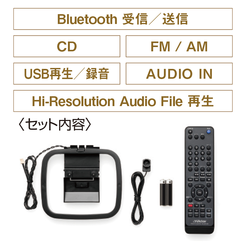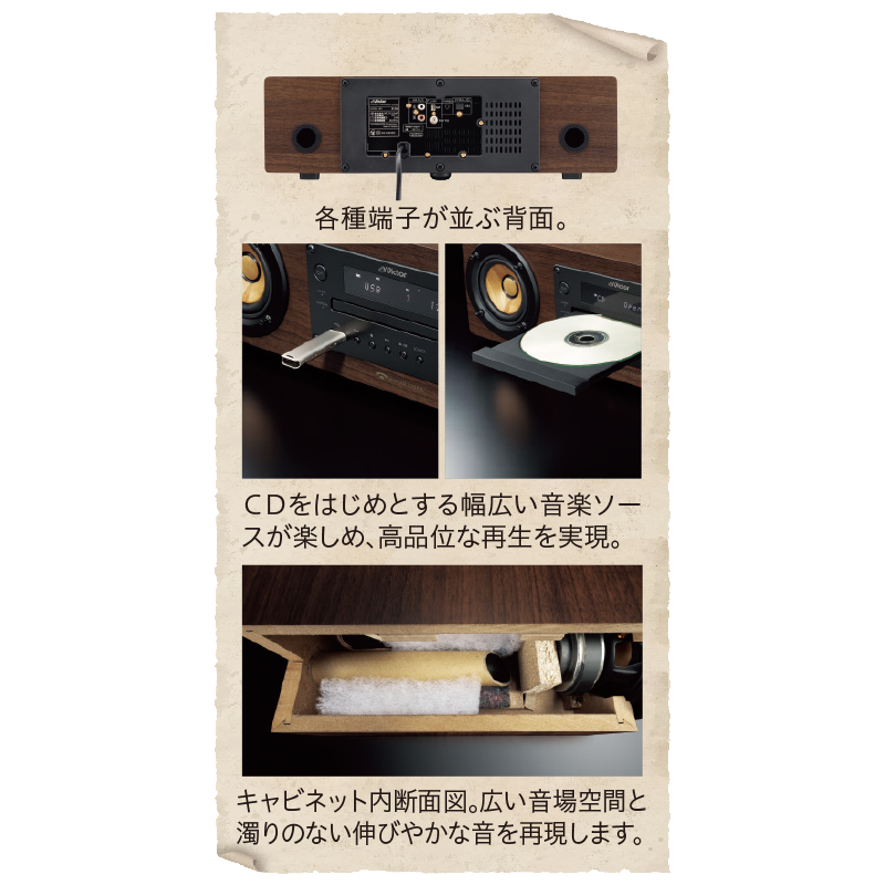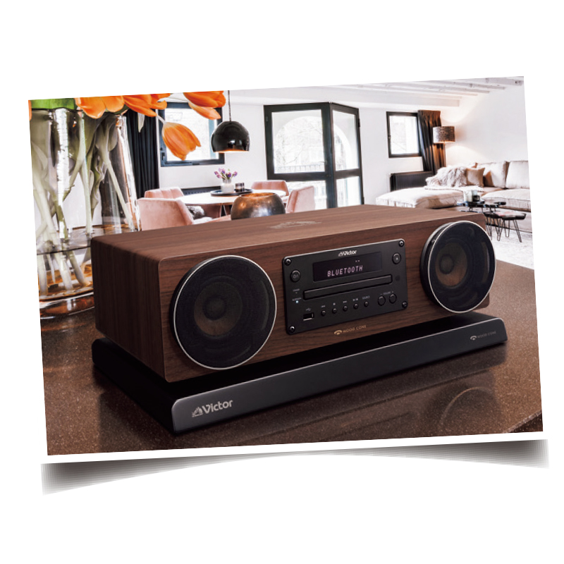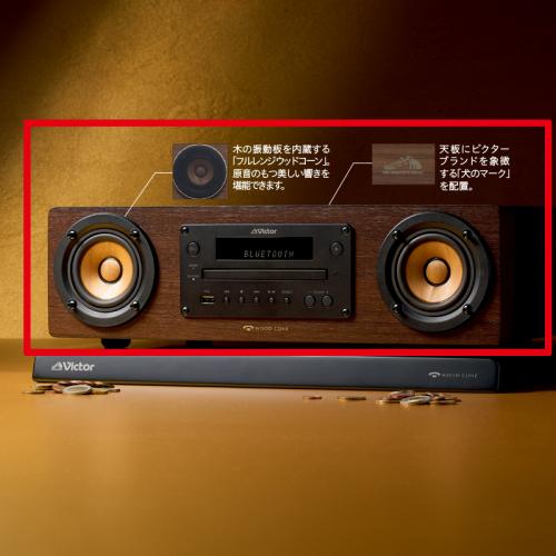 木が奏でる美しい響き。ウッドコーン・インテリアオーディオ。 美しい響きを木に求めたビクターの技術の結晶、一体型システムコンポ。最大の特長は「スピーカーは楽器でありたい」という思いから生まれた「木」を振動板とする独自のウッドコーンスピーカー。理想的な音響特性をもつ「木」だからこそ表現できた、自然で美しい響きを堪能できます。 ●サイズ(約):幅45×奥行29×高さ13.6cm/電源コード長さ=1.6m ●重量(約):7.1kg ●材質:MDF、他 ●電源:AC100V ●消費電力:24W ●アンプ:最大出力20W+20W /音声入力端子=アナログ(RCA)×1、光デジタル×1/ヘッドホン出力=直径3.5mmステレオミニ×1、USB端子×1 ●スピーカー:1ウェイバスレフ型、フルレンジ8.5cmウッドコーン×2 ●仕様:CD部再生可能メディア=音楽CD、CD-R/RW(MP3、WMA)/USB部録音フォーマット=MP3/USB部再生可能フォーマット=WAV、FLAC、MP3、WMA/ラジオ=AM・FM(ワイドFM対応/Bluetooth機能/時計・タイマー=再生・録音・スリープ機能/重低音強弱機能=BASS、TREBLE音質調整/L/Rバランス調整 ●付属品:リモコン(単4形乾電池×2・付)、FM簡易型室内アンテナ、AMループアンテナ ●マレーシア製 ※ご使用後の返品・交換はお受けできません。