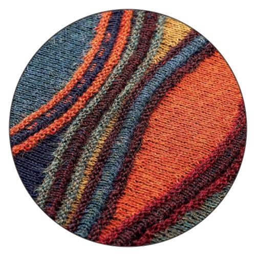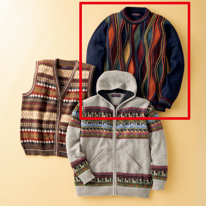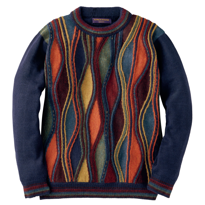 縦に流れるデザインが目を惹くセーター。 ブルー地に多色使いで縦に流れるようなラインを編み上げたデザインはパッと目を惹くほど個性的。一枚で着映えするだけでなく、柄の形状が全体をすっきりと見せる効果もあります。 ●カラー:ネイビー系 ●重量(約):300g(L) ●素材:アルパカ100% ●ドライクリーニング可 ●ペルー製 ※商品の性格上、一点一点柄の出方等が異なります。