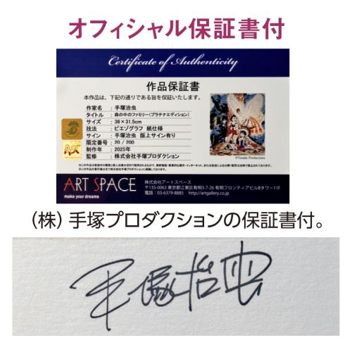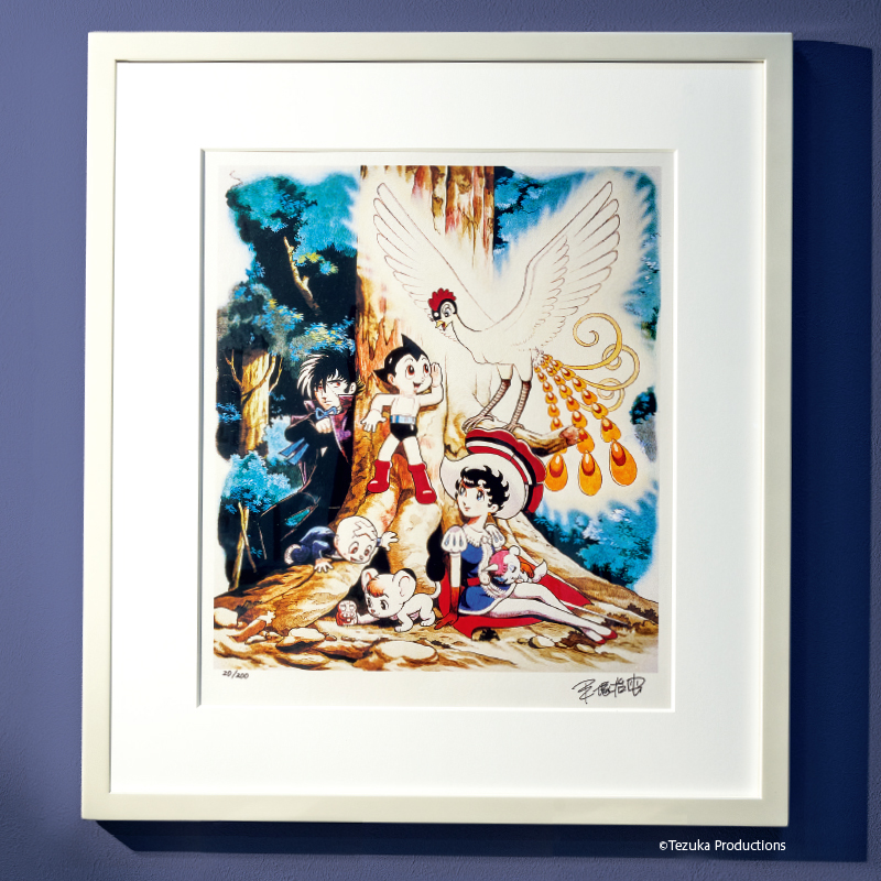 漫画の神様、手塚治虫の傑作が一堂に会して。 『火の鳥』、『鉄腕アトム』、『ジャングル大帝』など手塚漫画の代表的なキャラクターが森の中に勢揃い。(株)手塚プロダクション監修の下、制作されたプレミアムな版画です。印刷部分はメタリックペーパーを使用し、高級感が漂う仕上がりとなっています。コレクターズアイテムとしてもお部屋に飾るインテリアとしても垂涎の的となる、まさに夢のような作品です。●額カラー:パールホワイト ●サイズ(約):画寸=縦36×横31.5cm/額寸=縦56×横50×厚さ2.5cm ●重量(約):2kg ●材質:額=木、アクリルガラス/版画=メタリックペーパー ●(株)手塚プロダクション保証書(シール)付 ●シリアルナンバー入り ●手塚治虫版上サイン入り ●日本製 ※シリアルナンバーのご指定はお受けできません。 ※梱包作業のため、お届けまで約7~8週間かかります。