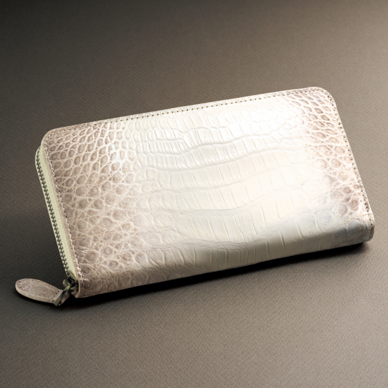 稀少な色の変化がセレブたちも魅了。 ホワイトからダークトーンに移り変わる色合いが、雪解けのヒマラヤ山脈を彷彿させることからその名がついた「ヒマラヤクロコダイル」。クロコダイルのなかでも稀少性が高い腹革を丁寧になめし、贅沢にセンター取りしたものを使用。革のなめしの段階で脱色加工を施し、世界でも数少ない熟練のタンナーの技術で美しいグラデーションを浮かび上がらせました。使うたびに、「皮革の王様」と呼ばれるゴージャスな質感と大自然の雄大さを感じさせる色彩の妙を実感する心豊かな日々をお過ごしください。 ●カラー:ホワイト系 ●サイズ(外寸・約):幅19.5×高さ11×厚さ2.5cm ●重量(約):240g ●材質:表地=クロコダイル革(シャムクロコダイル革)/裏地=牛革、ポリエステル ●仕様:ラウンドファスナー開閉、札入れ×4、オープンポケット×2、カード入れ×12、ファスナー式小銭入れ×1/背面=オープンポケット×1 ●ベトナム製 ※この商品はワシントン条約「CITES」の条約に基づき、輸入された養殖原皮を使用しております。 ※商品の性格上、一点一点風合い等が異なります。
