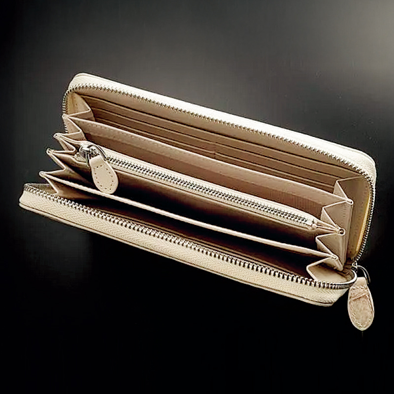 お札やカードなどがたっぷり入る合計20ポケットが自慢。素材の美しさだけでなく、実用性にも配慮が行き届いています。