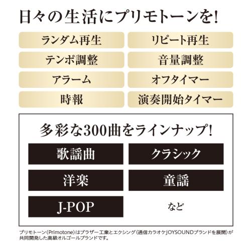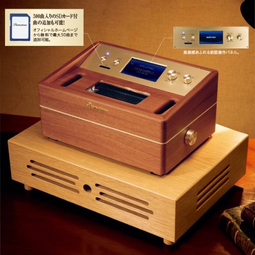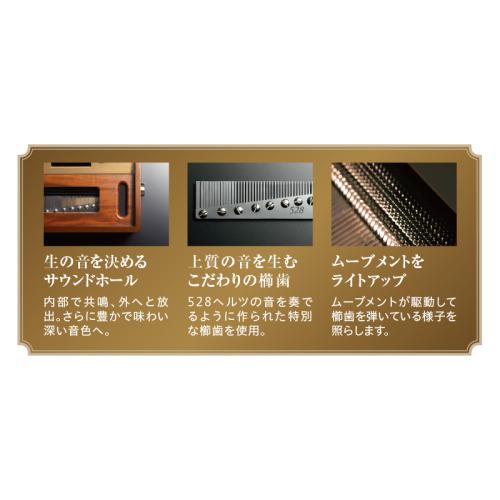 心身を整える音色のオルゴール。 オルゴールの心臓部ともいわれる櫛歯は、熟練職人が一本一本研磨と調律を行い、ストレスを軽減するとされる528ヘルツの音色を奏でます。優れた音を響かせるのは、伝統工法の木組で仕立てられた格調高く美しいマホガニーの筐体。電子制御によるメカニズムでぜんまいを巻く必要もなく、300曲(歌謡曲、クラシック、童謡ほか)がお好きなテンポや音量で長時間楽しめます。 ●カラー:ナチュラル系 ●サイズ(約):本体=幅30.4×奥行21×高さ14.4cm/共鳴台=幅40×奥行31.5×高さ12.3cm/電源コード長さ=約3m ●重量(約):本体=3.9kg/共鳴台=2.9kg ●材質:本体=天然木(マホガニー)、他/共鳴台=天然木(ナラ) ●電源:AC100V ●消費電力:6W ●仕様:櫛歯=40弁/300曲生演奏/演奏機能=再生、一時停止、ジャンル再生、ランダム再生、1曲リピート再生、テンポ調整、音量調整、アラーム機能、オフタイマー機能、時報機能、演奏開始タイマー ●付属品:SDカード1枚(300曲入り・最大350曲まで追加可能) ●日本製 ※天然木のため、一点一点風合いが異なる場合があります。 ※商品の性格上、開封後の返品・交換はお受けできません。 ※お届けまで約2週間かかる場合があります。