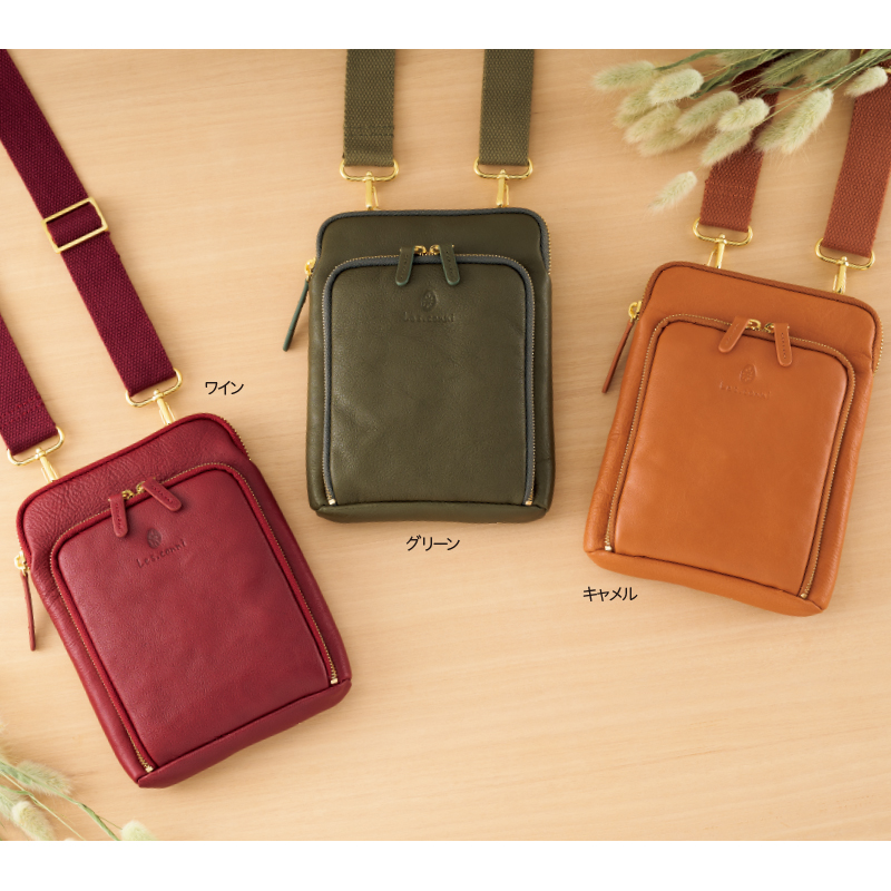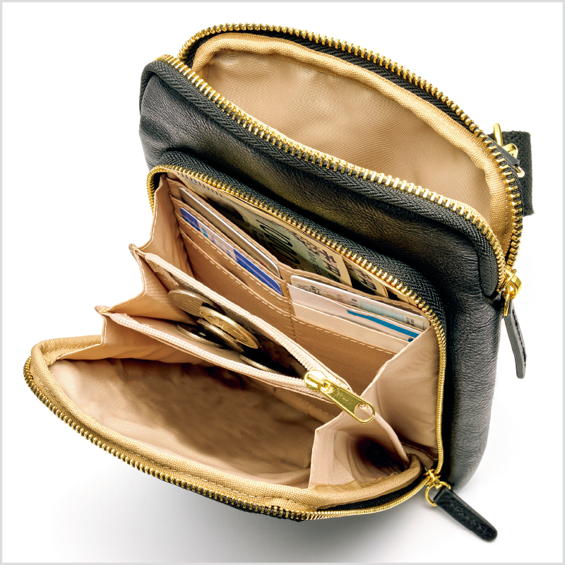 お出かけはこれ一つ!お財布兼用ショルダー。 身の周りの小物を入れて身軽にお出かけできる小ぶりのショルダーバッグ。フロントにお財布機能付なのでスマートに持て、小さくても高級感のある牛革製です。 ●サイズ(外寸・約):幅14×高さ19.5×厚さ3cm/ショルダーベルト長さ=72~130cm(着脱可) ●重量(約):260g ●材質:表地=牛革/裏地=綿 ●仕様:ファスナーメインコンパートメント/前面=ダブルファスナーコンパートメント(内部に札入れ×2、カード入れ×6、オープンポケット×1、ファスナー式小銭入れ×1) ●ベトナム製