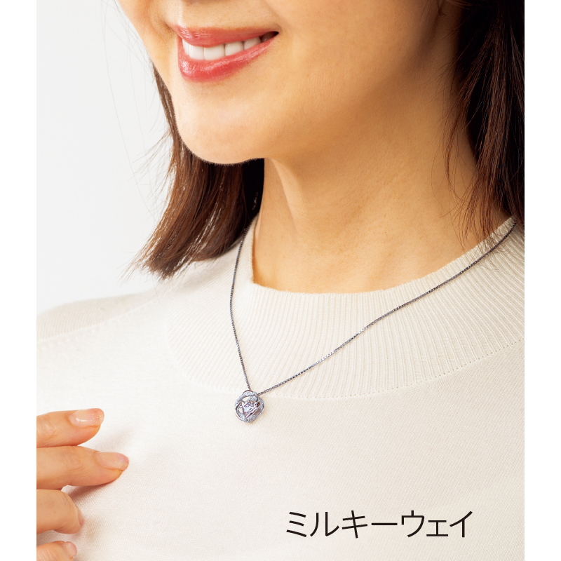 視線を引きつける止まらない輝き。 わずかな動きを感じて美しく煌めき続ける「ダンシングストーン」を使用。2種類のデザイン共に大きな一粒石が存在感を放ちます。 ●サイズ(約):ミルキーウェイ=縦14×横13×厚さ6mm/フェアリードロップ=縦14×横9×厚さ4.5mm/チェーン(共通)=長さ45cm(アジャスター部5cm含む) ●重量(約):ミルキーウェイ=4g/フェアリードロップ=2.5g ●材質:ミルキーウェイ=キュービックジルコニア(中石=クロスフォーカット、6.5mm×1/脇石=ラウンドカット、0.9mm×3、1.0mm×6、1.2mm×8)/フェアリードロップ=キュービックジルコニア(中石=クロスフォーカット、5.0mm×1)/枠・チェーン(共通)=シルバー925(ロジウムメッキ) ●留め具:引き輪式 ●付属品:ギャランティカード、専用ケース、ショッパー ●ベトナム製