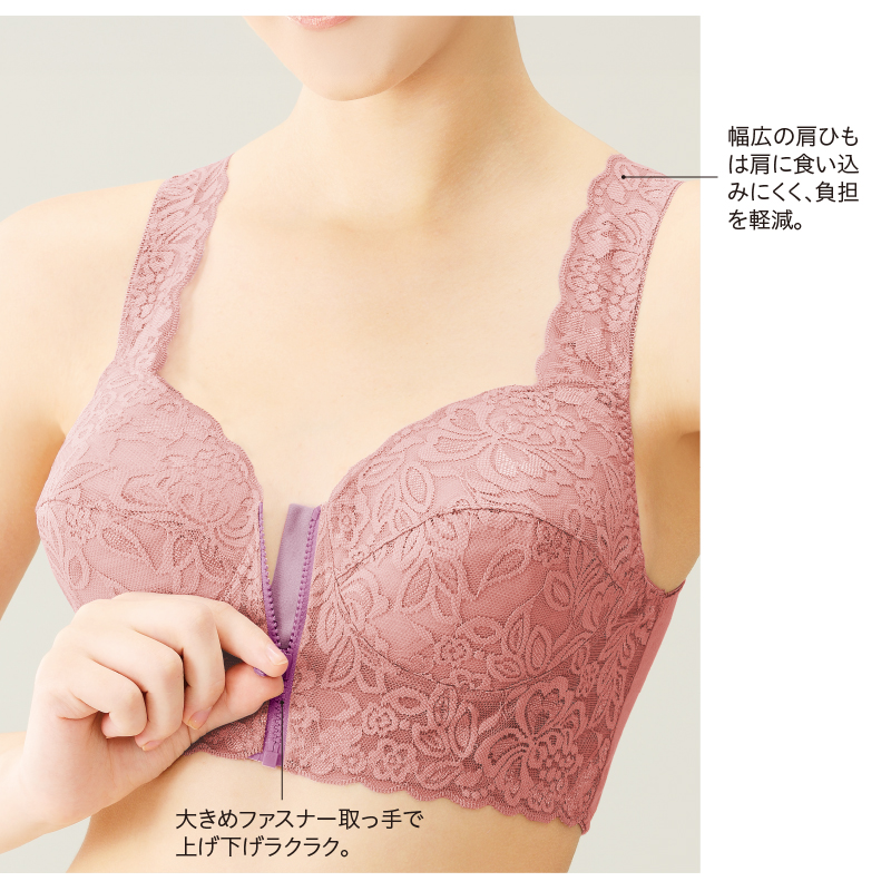 前開きで、脱ぎ着がラクラク。 後ろに手を回さずにすみ、着脱が大変ラクです。前面は美しいレース使い。締め付けずに安定感があります。 ●素材:綿、ポリエステル、他 ●セット内容:ローズ、アプリコット、ライトパープルの同サイズ3色組 ●手洗い可 ●中国製 ※衛生商品のため、開封後の返品・交換はお受けできません。