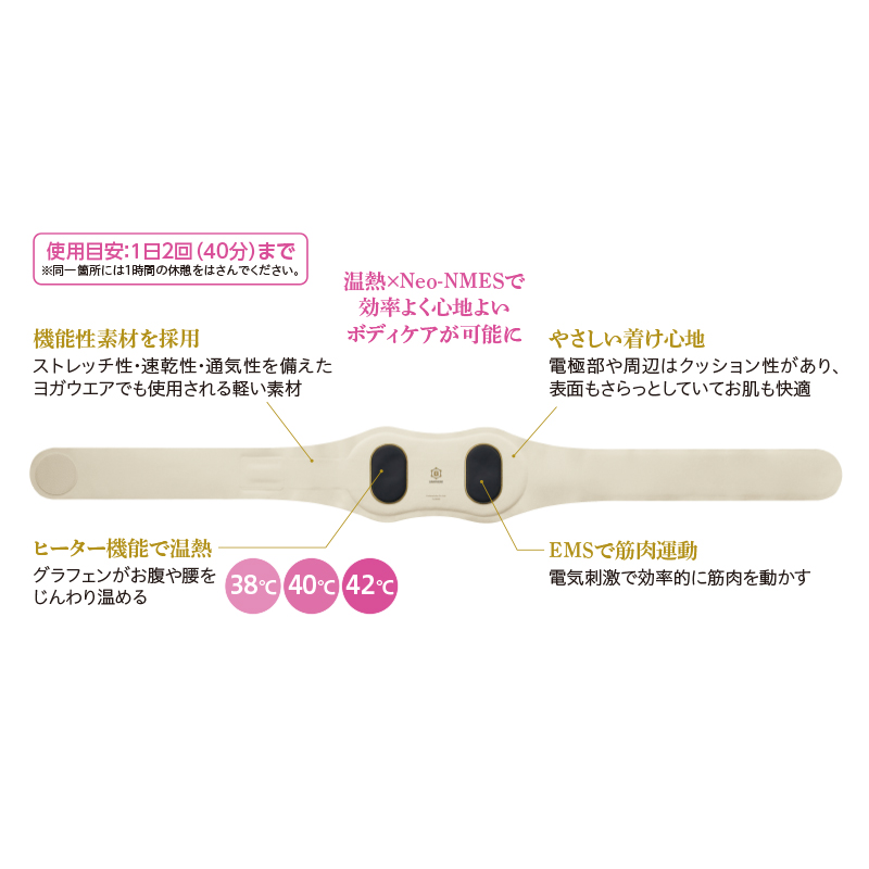 心地よく筋肉を360度動かす温熱ベルト。 ヒーターで筋肉を温めてからEMSで刺激。楽ちん筋トレをより効果的に。 ●カラー:ライトグレー ●サイズ(約):幅11.5×長さ96×厚さ最大2(コントローラー・固定ベルトセット時)cm/延長ベルト=幅6×長さ35cm/適応ウエスト65~95cm(延長ベルト使用時最大130cmまで) ●重量(約):130g ●素材:本体=ナイロン、ポリウレタン、グラフェン、ABS樹脂/コントローラー=ポリカーボネート、ABS樹脂 ●電源:リチウムイオン充電池(DC3.7V/2000mAh) ●充電時間(約):2.5時間 ●連続使用時間(約):30時間 ●仕様:施術モード=シェイプ、タッピング、リフレ、トレーニング/EMS出力=10段階調節/温熱=3段階調節(38・40・42度) ●セット内容:固定ベルト、延長ベルト、コントローラー、USBケーブル(TypeC) ●中国製 ※通電後の返品・交換はお受けできません。