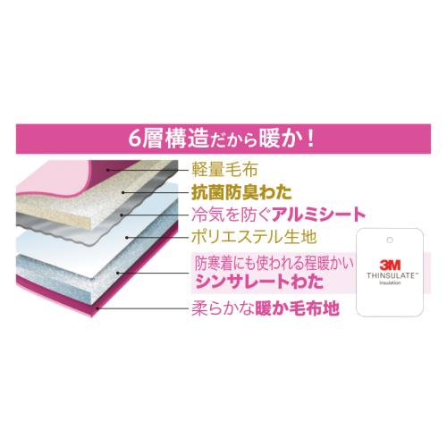 防寒着に使われるシンサレートわたや冷気を防ぐアルミシートなど軽くて暖かい厳選素材を6層に重ねました。