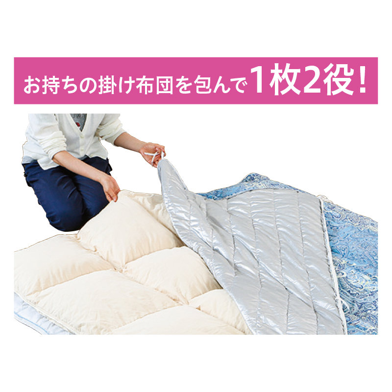 毛布にもカバーにもなる1枚2役。L字ファスナーで掛け布団の出し入れもスムーズ。