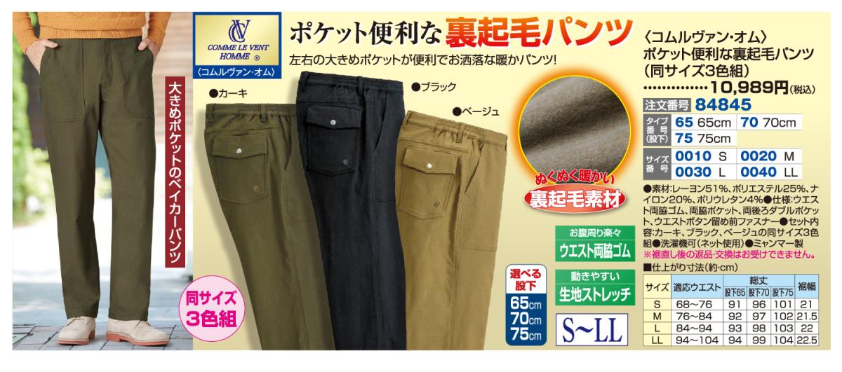 3. 〈コムルヴァン・オム〉ポケット便利な裏起毛パンツ(同サイズ3色組)