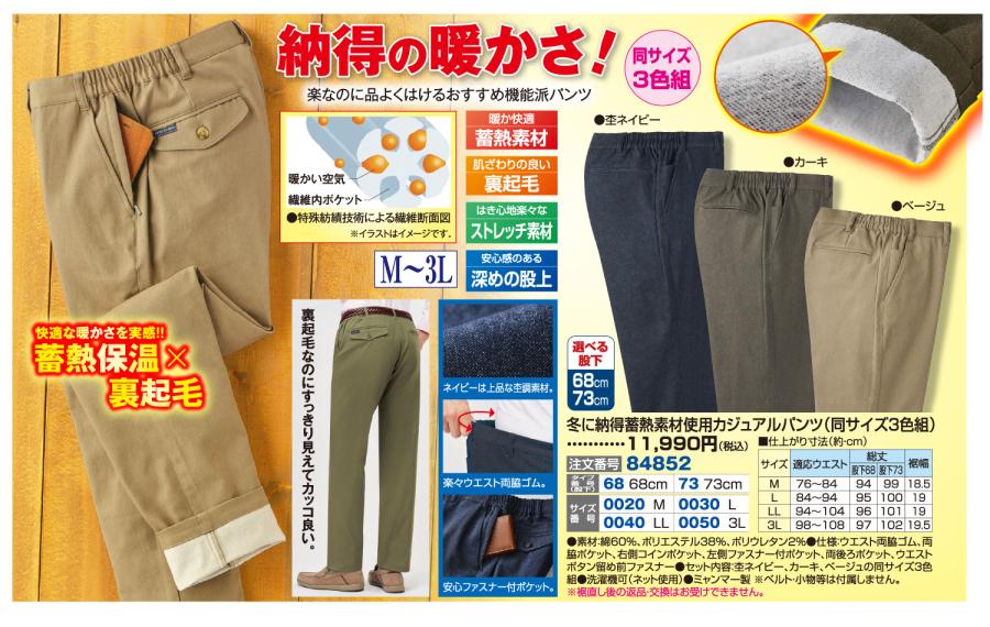 冬に納得蓄熱素材使用カジュアルパンツ(同サイズ3色組)