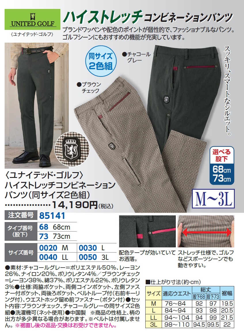 <ユナイテッド・ゴルフ>ハイストレッチコンビネーションパンツ(同サイズ2色組)