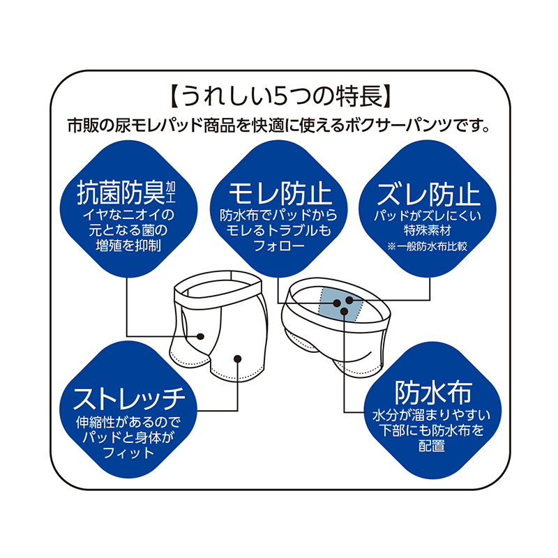 紙パッドに対応したブリーフです。尿ジミやニオイに気を使いました。 アウターへの尿ジミやニオイが気になる、そんな声から肌着メーカーのグンゼが開発・製造したボクサーブリーフです。市販の紙パッド対応のシミ防止機能に加え、抗菌防臭加工でニオイにも気を配るなど、うれしい5つの特長を備えました。もちろん紙パッドなしでもはけます。 ●素材:本体=綿95%、ポリウレタン5%/腰ゴム部=ナイロン55%、ポリエステル40%、ポリウレタン5%/裏マチ部=ポリエステル100% ●仕様:前あき ●セット内容:ブラック×2、グレー×2の同サイズ2色 計4枚組 ●洗濯機可 ●中国製 ※尿ジミ紙パッドは付属しません。 ※衛生商品のため、開封後の返品・交換はお受けできません。