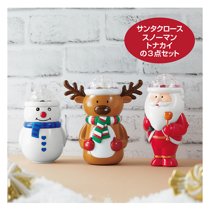 ミラーボールの輝きで気分アップ。音と光で楽しいクリスマス。 サンタクロース、トナカイ、スノーマンのクリスマスオブジェ。頭部のライトが音楽に合わせてミラーボールのように輝いて気分を盛り上げます。机や棚などに気軽に飾れます。 ●セット内容:①サンタクロース、②スノーマン、③トナカイ ●サイズ・重量(約):①=幅7.5×奥行6.5×高さ15.5cm・100g/②=幅7.5×奥行6.5×高さ13cm・108g/③=幅13×奥行6.5×高さ15cm・110g ●材質:プラスチック ●電源(1体):単3形アルカリ乾電池×3(別) ●仕様:点灯時の音声の有無は選択可 ●中国製 ※ご使用後の返品・交換はお受けできません。