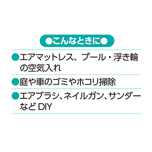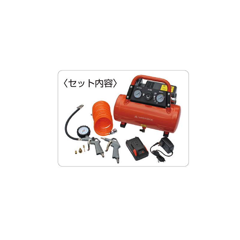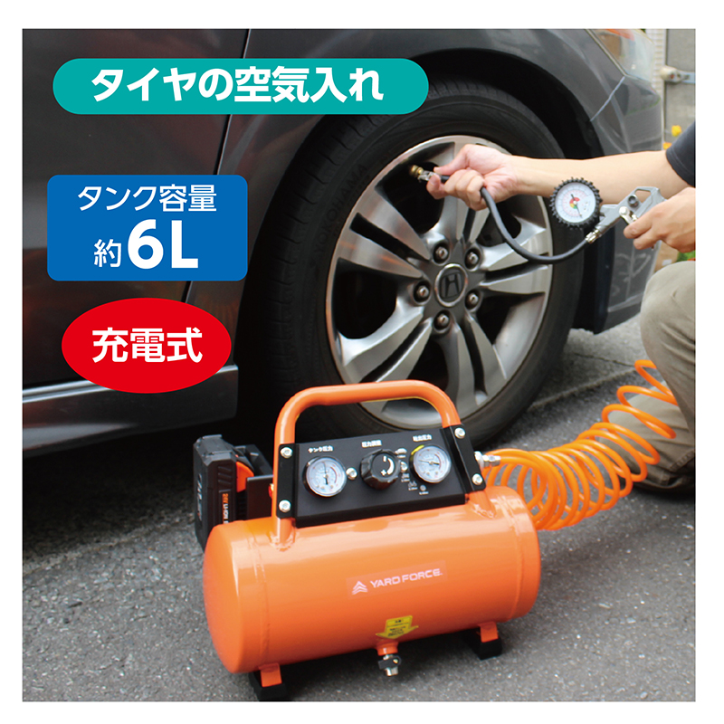 タイヤの空気充填やホコリ掃除に、電源不要でどこでも使える。 電源を気にせず使えるバッテリー式ポータブルコンプレッサー。簡単な操作で気圧を設定でき、設定気圧とタンク内気圧を数値で把握できます。コンパクトなサイズで最大圧力は乗用車タイヤの約3倍まで対応します。 ●サイズ(外寸・約):本体=幅36×奥行30×高さ32cm/充電コード長さ=1m ●重量(約):本体=7.4kg/バッテリー=460g ●タンク容量(約):6L ●材質:スチール、樹脂、他 ●電源:24Vリチウムイオン充電池 ●充電時間(約):80分 ●最高使用圧力(約):8bar ●再起動圧力(約):6bar ●最大吐出量(約):45L/分 ●作動音(約):92dB ●付属品:バッテリー、充電用ACアダプター、エアダスター、ゲージ付タイヤチェック ●中国製 ※24V専用予備バッテリーは注文番号:84726をご参照ください。 ※ご使用後の返品・交換はお受けできません。