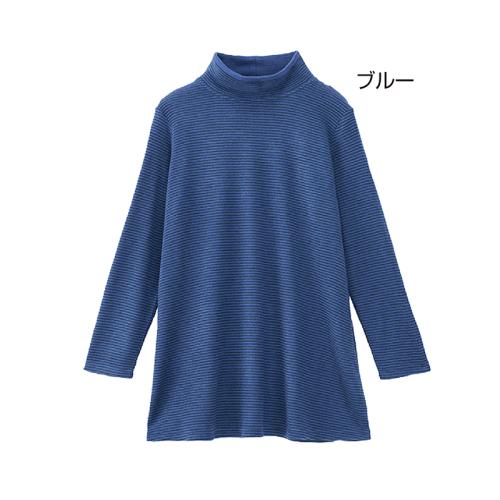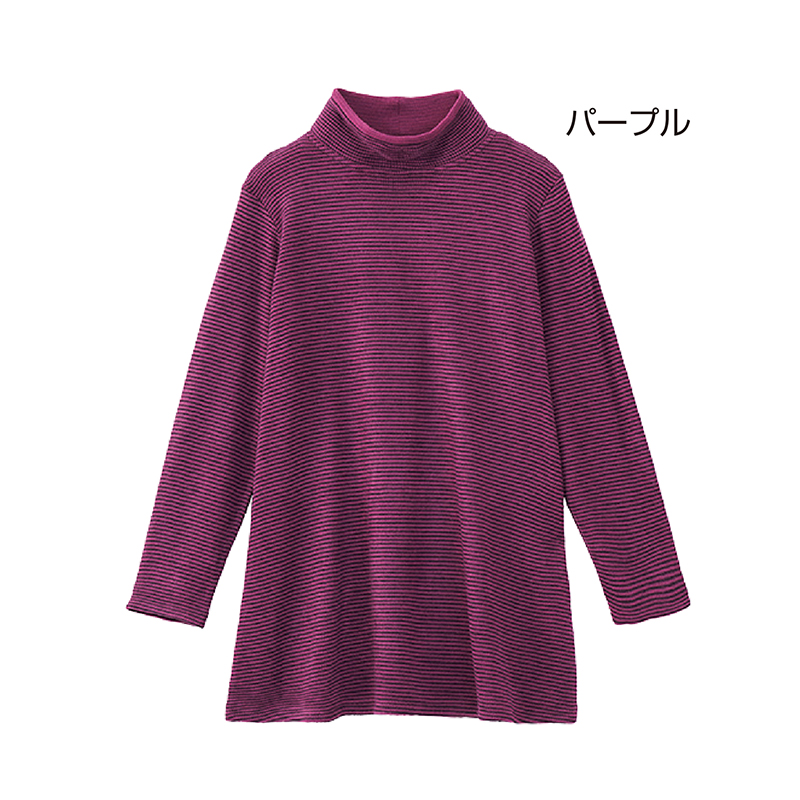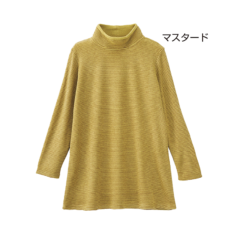 Aライン&ぽかぽか素材ですっきり美シルエット。 吸湿発熱素材「ソリストヒート」使用。表起毛で肌触りが良く、どんな装いにも合わせやすい細ボーダー柄を採用。ゆったりとしたラインとほどよいハイネックで洗練された印象に。 ●素材:アクリル90%、レーヨン10% ●洗濯機可(ネット使用) ●日本製 ※アクセサリーは付属しません。