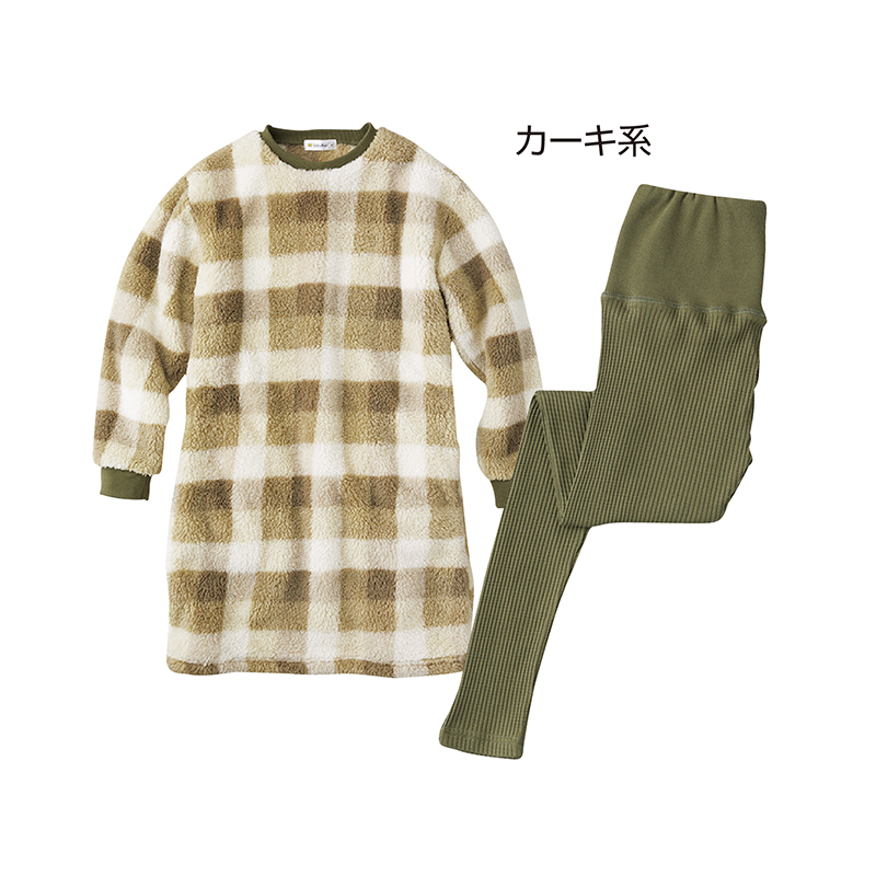 太ももまでカバーしてしっかり暖か。 程よい厚みと伸縮性で着心地の良いふわふわ素材チュニック。同系色のレギンスと合わせ、ワンマイルウエアとしてもお使いいただけます。 ●素材:上着=ポリエステル100%/リブ部分=ポリエステル65%、綿30% ポリウレタン5%/レギンス=ポリエステル65%、綿30%、ポリウレタン5% ●仕様:上着=両脇ポケット/レギンス=ウエスト総ゴム(ゴム取替口あり) ●洗濯機可 ●カンボジア製 ※商品の性格上、一点一点柄の出方が異なります。