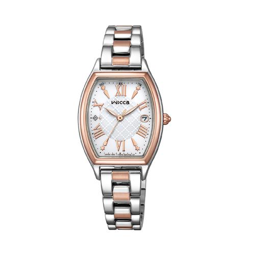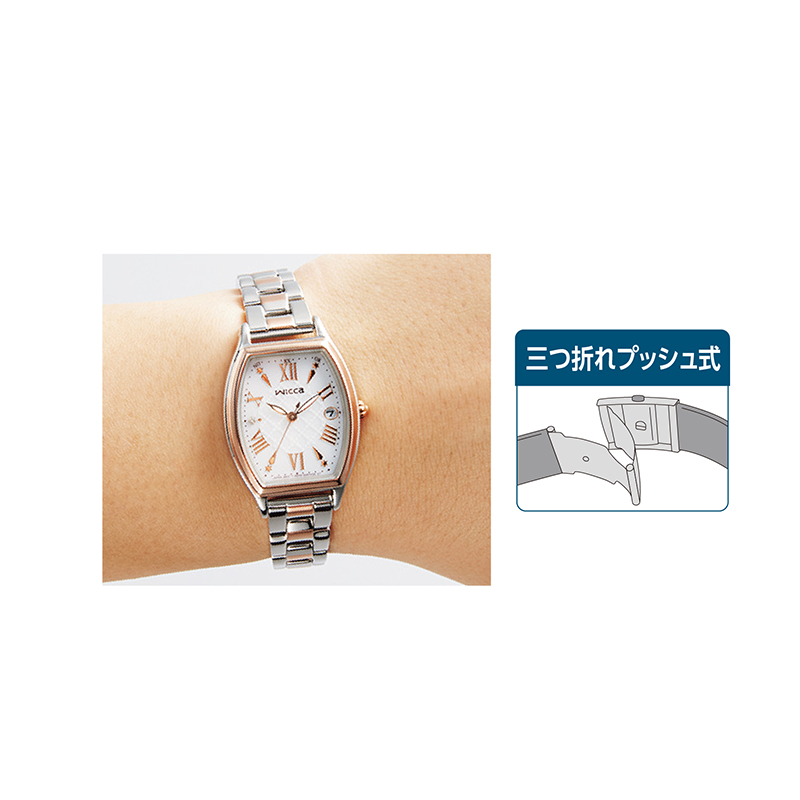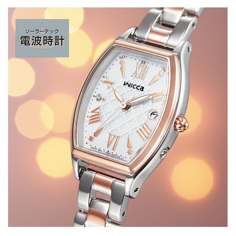 女性らしい知性と品格を備え、見やすくなった新モデル。 テーマは「inner star」。幾何学模様の文字板やクリスタル、数字部分などこだわりの詰まったデザインには「自分の中にスターを持ち、自信を持って前に進めるように」との想いが込められています。 ●カラー:シルバー×ピンクゴールド ●サイズ(約):ケース=直径25×厚さ7.8mm/適応手首周り=12.8~17.8mm ●重量(約):48g ●材質:ケース・ベルト=ステンレス(一部メッキ=ピンクゴールド色)/風防=クリスタルガラス ●仕様:日本製クォーツムーブメント、平均月差±15秒(非受信時)、光発電方式(フル充電時約2.5年可動、パワーセーブ作動時)、5気圧防水、パーペチュアルカレンダー、日付表示、時差設定機能、シンプルアジャスト、耐磁1種、1ポイントクリスタルガラス入り ●留め具:三つ折れプッシュ式 ●キャリーナンバー:H0F6 ●中国またはタイ製 ※一部電波の入りにくい場所(地下、ビル内など)があります。
