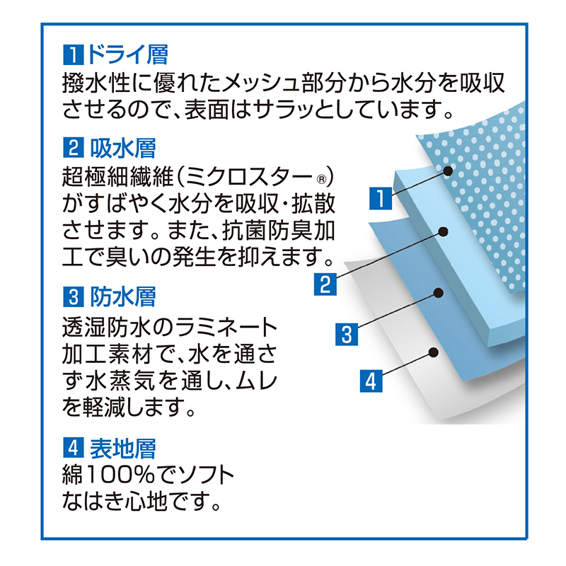 パッド部分は4層の安心吸収構造。通気性もよくムレを軽減。表面はいつもサラサラです。