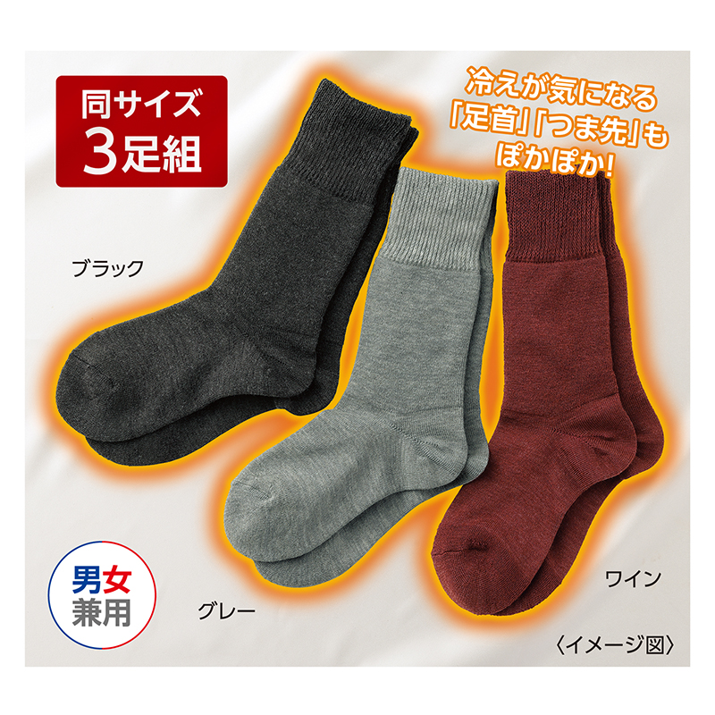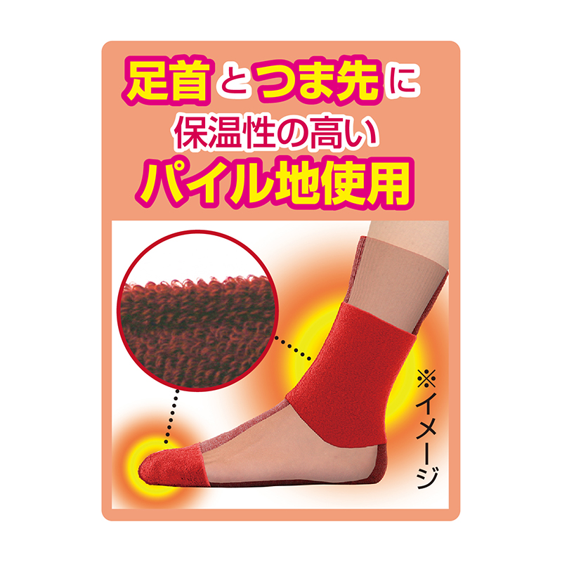 もう重ね履きは要らない! 足首・つま先にパイル生地を使用。暖められた空気を溜め込みやすく、足冷えの原因となりやすい箇所を暖めてくれます。さらに、靴下全体に吸湿発熱繊維「エクス 」を使用しています。 ●素材:アクリル、ポリエステル、その他 ●洗濯機可 ●日本製 ※ご使用後の返品・交換はお受けできません。