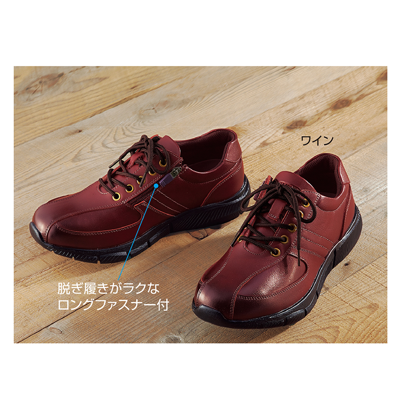 履きやすさを徹底的に追求。甲高&5E幅広設計の一足。 足もとをスマートに見せるスタイリッシュフォルム。幅広甲高のオールワイド5E設計で快適な履き心地です。大開口のロングファスナーで足入れ楽々。インソールクッションが足裏全体を包み込みます。 ●ワイズ:5E ●重量(約):290g(25.5cm・片足) ●材質:アッパー=牛革(床革)、合成皮革/ソール=合成底 ●中国製