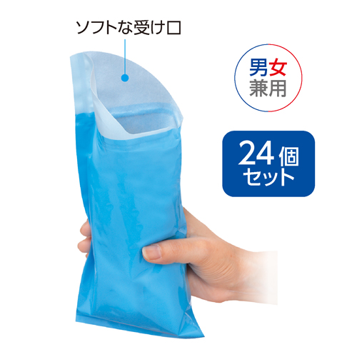 渋滞時の悩みを解消する緊急ミニトイレ。我慢できない急な尿意に便利です。 渋滞時の緊急事態に活躍するミニトイレ。おしっこはすぐに固まり、逆さにしてもこぼれる心配がありません。コンパクトで持ちやすく、男女、幼児、高齢者を問わず、ご使用いただけます。 ●サイズ(1個・約):縦27×横13cm ●重量(1個・約):32g ●材質:本体=ポリエチレン、高分子ポリマー、吸水紙、ポリプロピレン不織布、パルプ/受け口=ポリプロピレン不織布(ポリエチレンラミネート貼り)/捨て袋=ポリエチレン ●セット内容:24個セット ●日本製 ※廃棄の際は、お住まいの地域のルールに従って処理してください。 ※衛生商品のため、ご使用後の返品・交換はお受けできません。