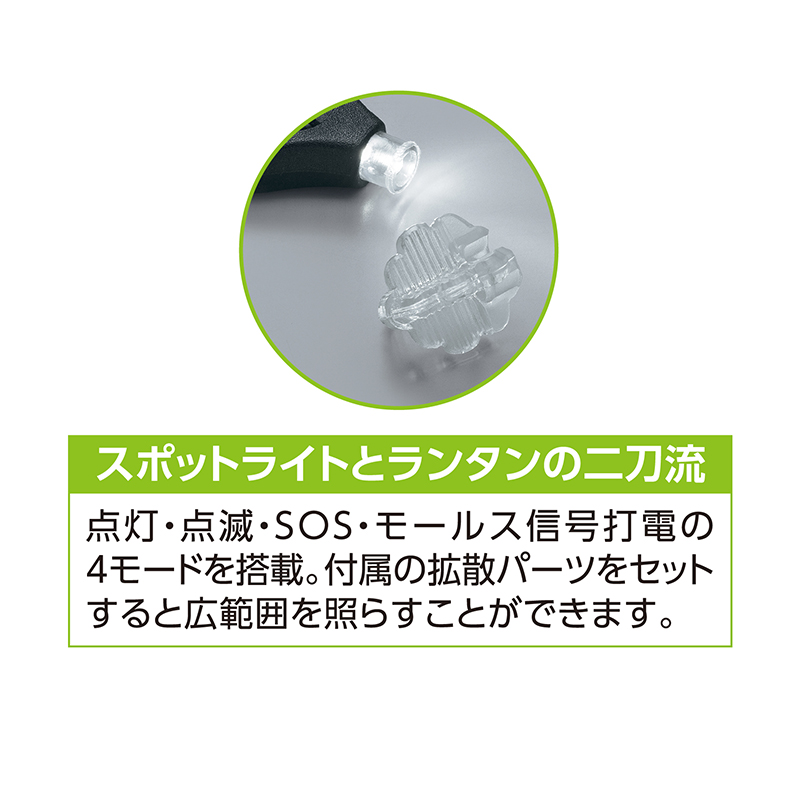 1.6km先でも光源をキャッチ! 親指サイズの本格懐中電灯。 高輝度LED、高い防水機能を強靭なボディーに搭載したパーソナルライト。電池式なので長く使えます。 ●カラー:本体=ブラック/LED=白色 ●サイズ(約):本体=幅2.4×奥行4×高さ0.8cm ●重量(約):10g ●材質:ガラス繊維強化ポリウレタン ●電源:CR-2016×2(付) ●連続点灯時間(約):18時間(電池新品時) ●モード:点灯(段々トーン明暗)、点滅(緩急)、SOS、モールス信号 ●仕様:明るさ=4.5ルーメン/IPX7防水 ●拡散器(ディフューザー)付 ●アメリカ製 ※ご使用後の返品・交換はお受けできません。