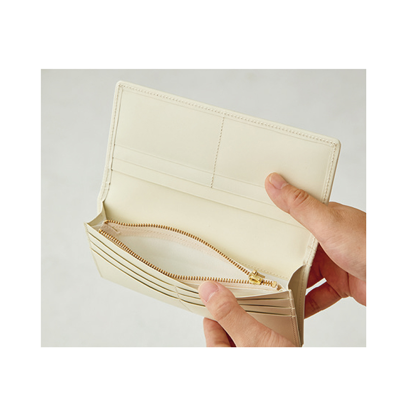 馬毛革を使用した縁起の良い財布。美しい毛並みと肌ざわりの良さを。 午年にふさわしく、上質な馬毛革を使った財布をご用意しました。新しい財布にウマくいくの思いを込めて。収納力もたっぷり。手にしたときの肌ざわりの良さを存分にお楽しみください。 ●カラー:ホワイト ●サイズ(外寸・約):幅19×高さ9×厚さ2cm ●重量(約):110g ●材質:表地=馬毛革/裏地=牛革 ●仕様:札入れ×1、ファスナー小銭入れ×1、カード入れ×10、オープンポケット×2 ●日本製 ※商品の性格上、一点一点風合い等が異なります。