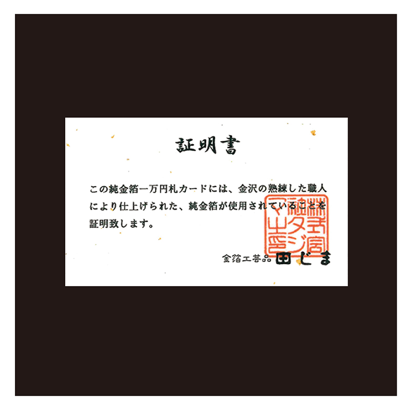 お財布に入れて金運アップのお守りに。加賀金箔一万円札。 角度によって渋沢栄一の姿が浮かぶ中央円形部、蒔絵のように美しい左端ホログラム、縁起のよい11111ゾロ目番号。純金箔1万円札に金運向上の願いを込めて。 ●サイズ(約):縦7.5×横16×厚さ0.1cm ●重量(約):5g ●材質:純金箔、PET ●金沢金箔工芸品 ●純金箔証明書付 ●日本製 ※実際の1万円札として使用することはできません。 ※折り曲げての収納はお控えください。