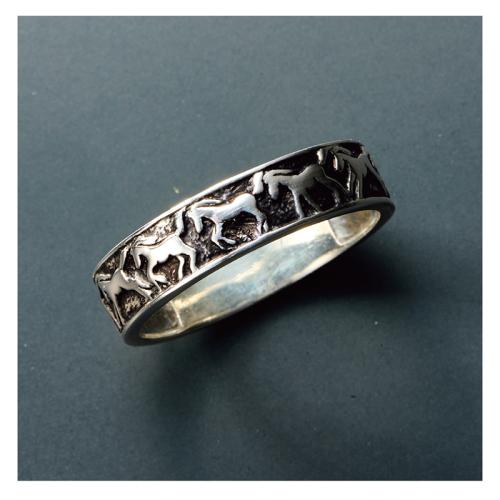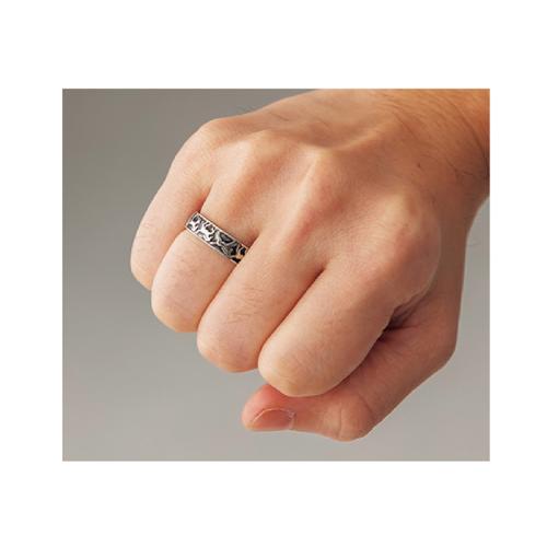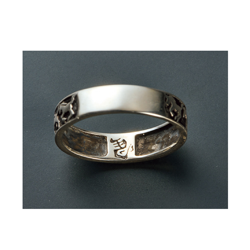 疾走する勢いもそのまま、すべてが馬九行久の祈りをリングに。 魔除けの力を秘めるとされる銀に、馬九行久(うまくいく)という祈りを込め、九頭馬を刻んだリング。リング内側に刻まれた左馬は、舞う(馬の逆さ読み)に通じ、飛躍運をもたらす縁起文字です。●サイズ(約):最大幅=5mm ●重量(約):3g(21号) ●材質:シルバー925(いぶし銀仕上げ) ●日本製 ※商品の性格上、一点一点色合い・風合い等が異なります。