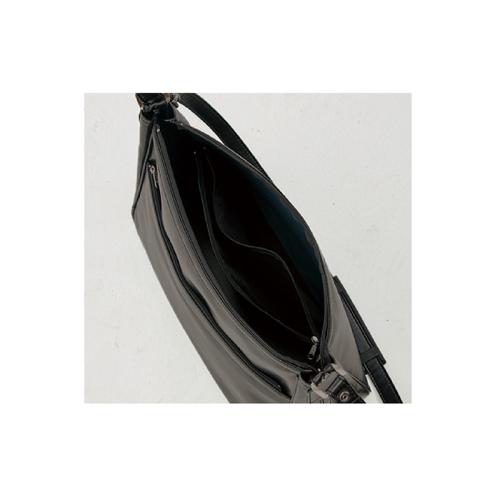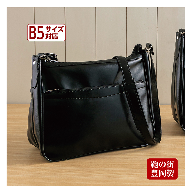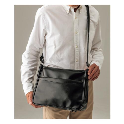 どこか懐かしい、レトロな味わいの横型ショルダー。B5サイズに対応します。 黒いボディカラーに横型デザイン。ずっと手にしていたような懐かしさに誘われます。幅広マチで日帰り旅行などの荷物もしっかり収納できます。 ●カラー:ブラック ●サイズ(外寸・約):幅33×高さ26×厚さ15cm/ショルダーベルト長さ=68~112cm(着脱不可) ●重量(約):420g ●材質:合成皮革、他 ●仕様:ファスナーメインコンパートメント(内部にファスナーポケット×1、オープンポケット×1)/前面=ファスナーポケット×1/底板・底鋲付 ●日本製