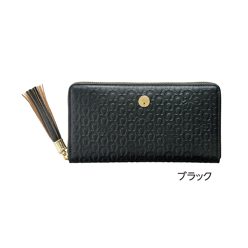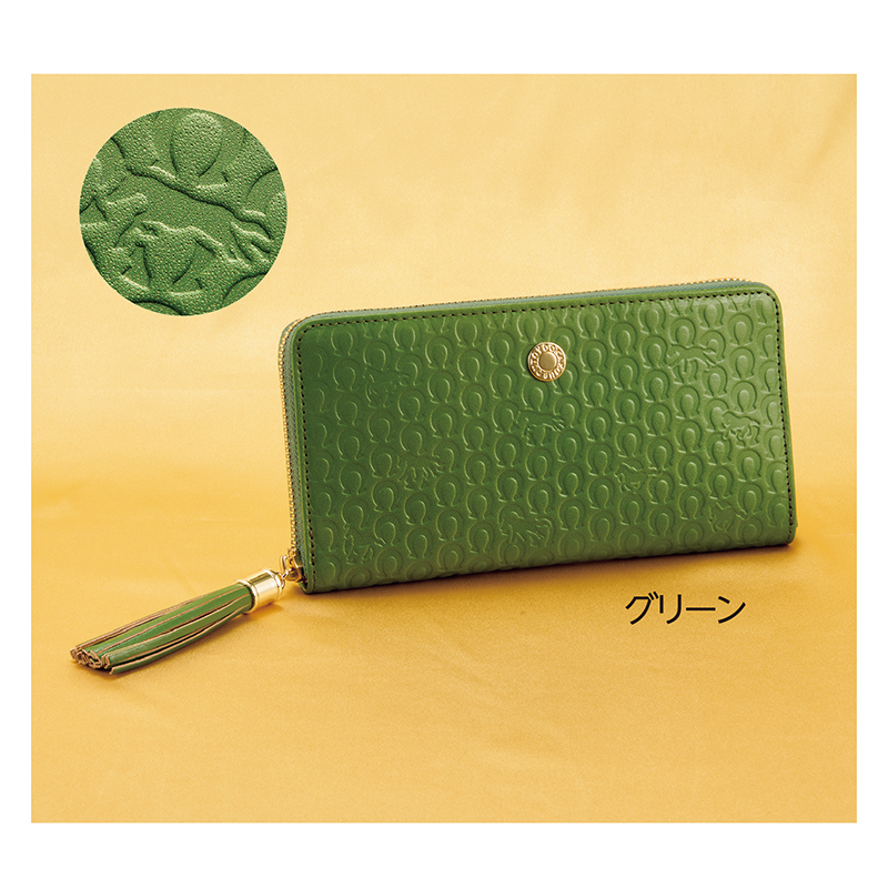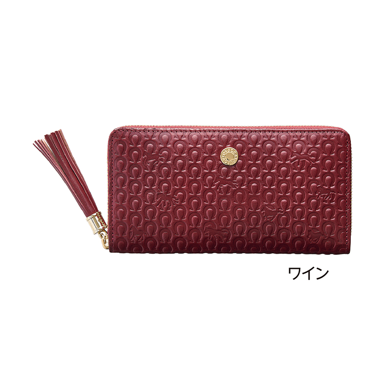 九頭の馬で馬九行久(うまくいく)。イタリア製ヌメ革で収納上手。 イタリア製の上質な牛ヌメ革を使用し、表面に馬蹄の間に九頭の馬を散りばめた小粋なデザインが光ります。タッセル使いで邪気払いも抜かりなし。女性の方にも似合います。 ●サイズ(外寸・約):幅19.5×高さ10×厚さ2cm ●重量(約):220g ●材質:表地=牛革(イタリアンレザー)/裏地=レーヨン ●仕様:ラウンドファスナー開閉、札入れ×2、ファスナー小銭入れ×1(内部4室)、カード入れ×12、オープンポケット×2 ●日本製