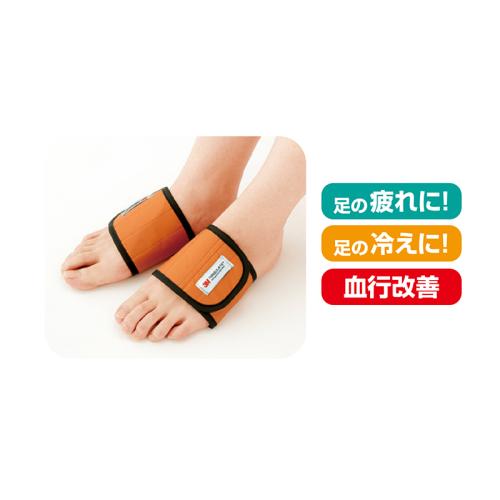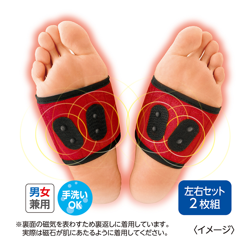 巻くだけで、血行を改善! 足裏あったかサポーター。 寝ている間に足裏ケア。冷える足裏に巻いて、血行改善と保温効果。足裏に密着する片足4個の磁気治療器がこりと血行を改善し、3M社製シンサレートを採用した6層のあったか素材でポカポカです。 ●カラー:オレンジ ●適応足の甲周り(約):19~26cm ●重量(1枚・約):15g ●材質:永久磁石(片足4個×2)/表地=ナイロン100%/中わた=シンサレート/裏地=ポリエステル100% ●仕様(約):磁束密度=90mT±20mT×8個 ●管理医療機器認証番号:222AGBZX00197000 ●販売名:磁気メディカルサポーター足裏用 ●手洗い可 ●日本製 ※ペースメーカーなどの電磁障害の影響を受けやすい体内埋め込み型医用電気機器、脳せき(脊)髄液短絡術用圧変化式シャントなどの磁器影響を受ける可能性のある医用電気機器を装着している方は使用できません。 ※ご使用後の返品・交換はお受けできません。