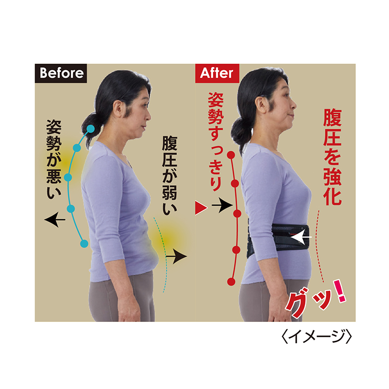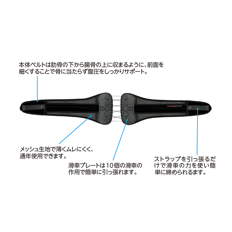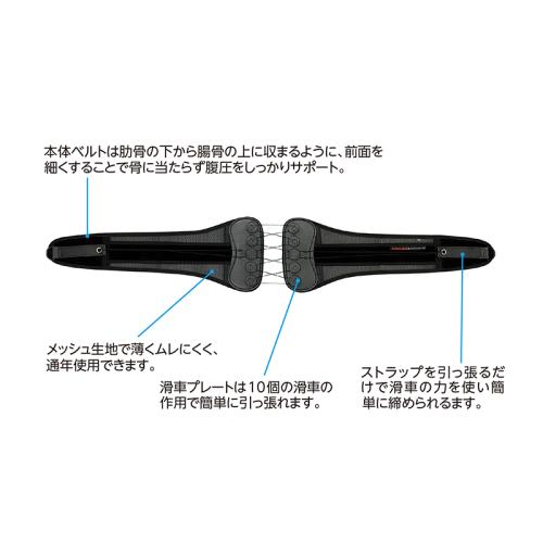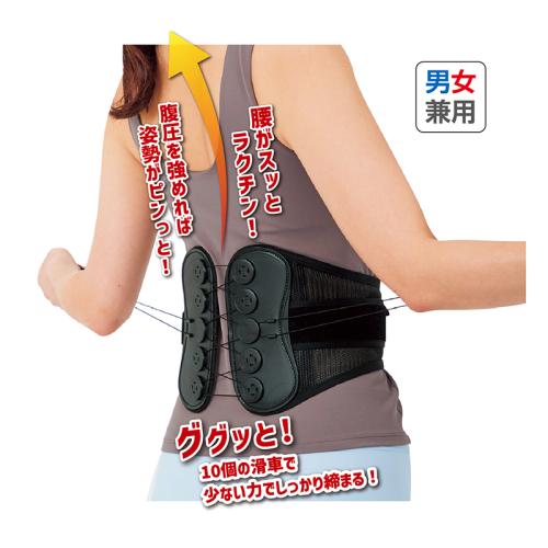 巻くだけで腹圧を強化! 動けるカラダをサポート。 滑車の力を借りて、楽々装着。強力引き締め効果で、腹圧を強め、体の動きをサポート。姿勢の悪化、腰痛、体幹が弱ってきたとお悩みのあなたにおすすめします。背面以外は細身の設計なので、衣服の着用も楽にできます。 ●カラー:ブラック ●重量(約):150g(M) ●材質:ポリエステル ●手洗い可 ●中国製 ※ご使用後の返品・交換はお受けできません。
