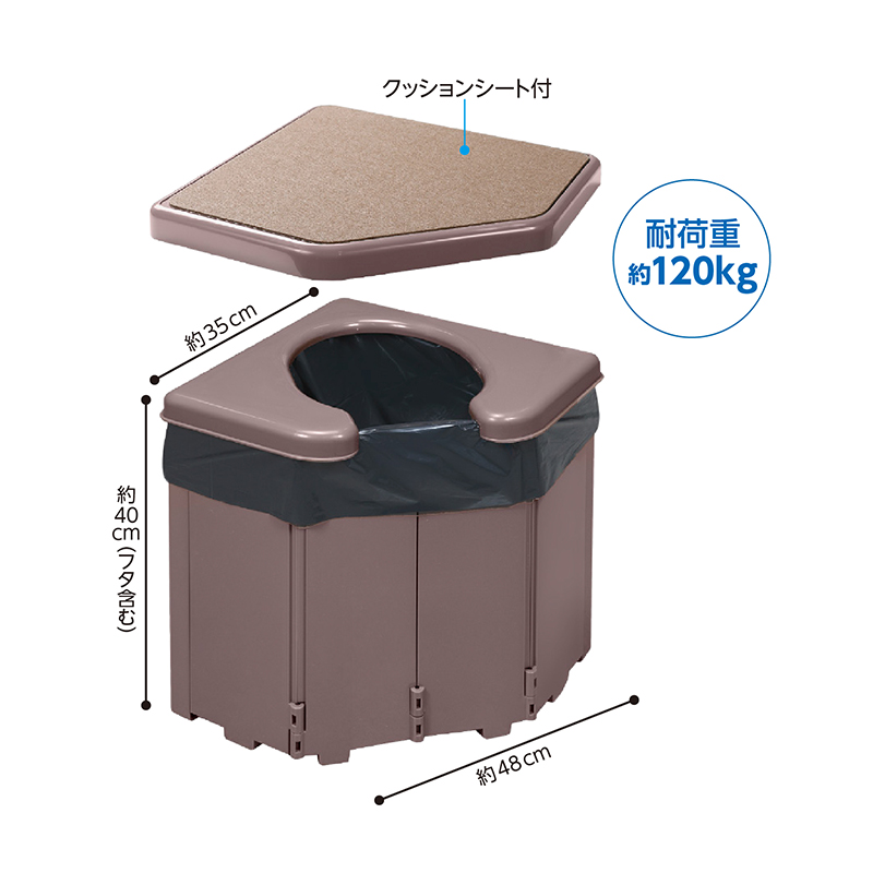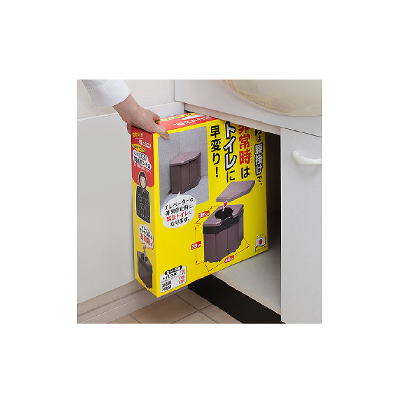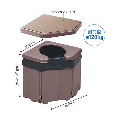 ふだんはコーナー腰かけ。緊急時はトイレに変身。 コーナーに置けて場所を取らず、汚れたら水洗いできる、ポータブルコーナートイレ。本体を開いて、底板で固定し、便座とフタを載せることで簡単に組み立てOK! 約120㎏の体重まで支えることができます。●サイズ(約):本体=幅48×奥行35×高さ(フタ含む)40cm/汚物袋=縦50×横65cm ●重量(本体・約):2.8kg ●耐荷重(約):120kg ●材質:本体・便座=ポリプロピレン/フタ=ABS樹脂/底板=木/クッションシート表面=ポリエステル100%・裏面=アクリル樹脂(カテキン入り)/凝固剤=高分子ポリマー/汚物袋=ポリエチレン ●セット内容:本体、便座、フタ、クッションシート、底板、汚物袋×10、凝固剤×10 ●日本製 ※廃棄の際は、お住まいの地域のルールに従って処理してください。 ※ご使用後の返品・交換はお受けできません。 ◆【85228】と【AA865】は同じ商品です。