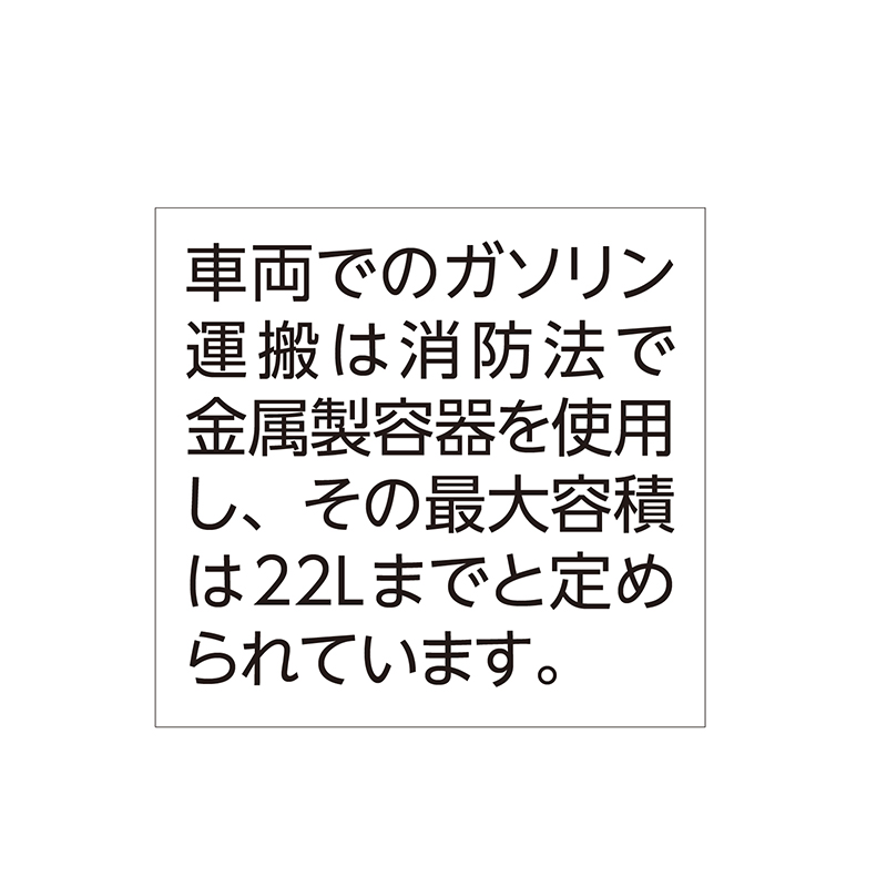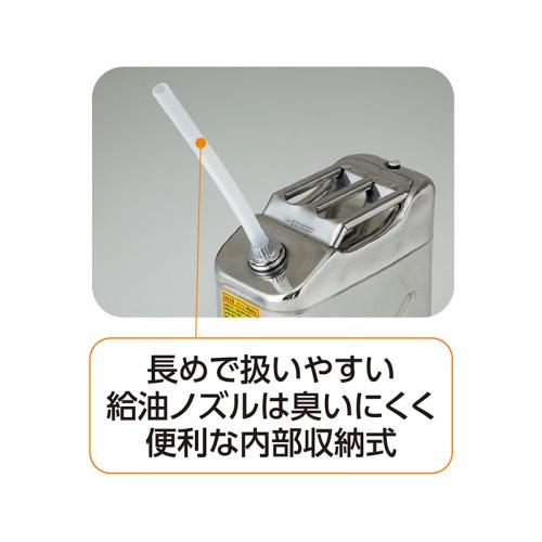 場所をとらない縦型。安心のステンレス製。 ステンレス鋼材SUS304採用で汚れにくく、錆びにくい、タフなガソリン携行缶。場所をとらない縦型で保管に便利。トリプルハンドルで持ちやすく、異物混入を防ぐノズルフィルター付です。●カラー:シルバー ●サイズ(約):本体=幅34.5×高さ27.8×奥行17.3cm/ノズル長さ=35cm/鋼材厚さ=0.8mm ●重量(約):2.6kg(ガソリン10L保管時10.1kg) ●容量(約):10L ●材質:本体=ステンレス鋼板(SUS304)/口金・キャップ=アルミニウム/ノズル=ポリエチレン ●付属品:給油ノズル(フィルター付)、給油ノズル収納袋、内容物表示ステッカー ●中国製 ※セルフ式ガソリンスタンドではご自身での給油はできません。 ※ご使用の際は必ず取扱説明書をお読みになり、正しくお使いください。 ※ご使用後の返品・交換はお受けできません。 ◆【85231】と【AA809】は同じ商品です。