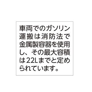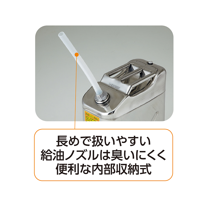 場所をとらない縦型。安心のステンレス製。 ステンレス鋼材SUS304採用で汚れにくく、錆びにくい、タフなガソリン携行缶。場所をとらない縦型で保管に便利。トリプルハンドルで持ちやすく、異物混入を防ぐノズルフィルター付です。●カラー:シルバー ●サイズ(約):本体=幅34.5×高さ46.5×奥行17.3cm/ノズル長さ=35cm/鋼材厚さ=0.8mm ●重量(約):3.7kg(ガソリン20L保管時18.7kg) ●容量(約):20L ●材質:本体=ステンレス鋼板(SUS304)/口金・キャップ=アルミニウム/ノズル=ポリエチレン ●付属品:給油ノズル(フィルター付)、給油ノズル収納袋、内容物表示ステッカー ●中国製 ※セルフ式ガソリンスタンドではご自身での給油はできません。 ※ご使用の際は必ず取扱説明書をお読みになり、正しくお使いください。 ※ご使用後の返品・交換はお受けできません。 ◆【85232】と【AA810】は同じ商品です。