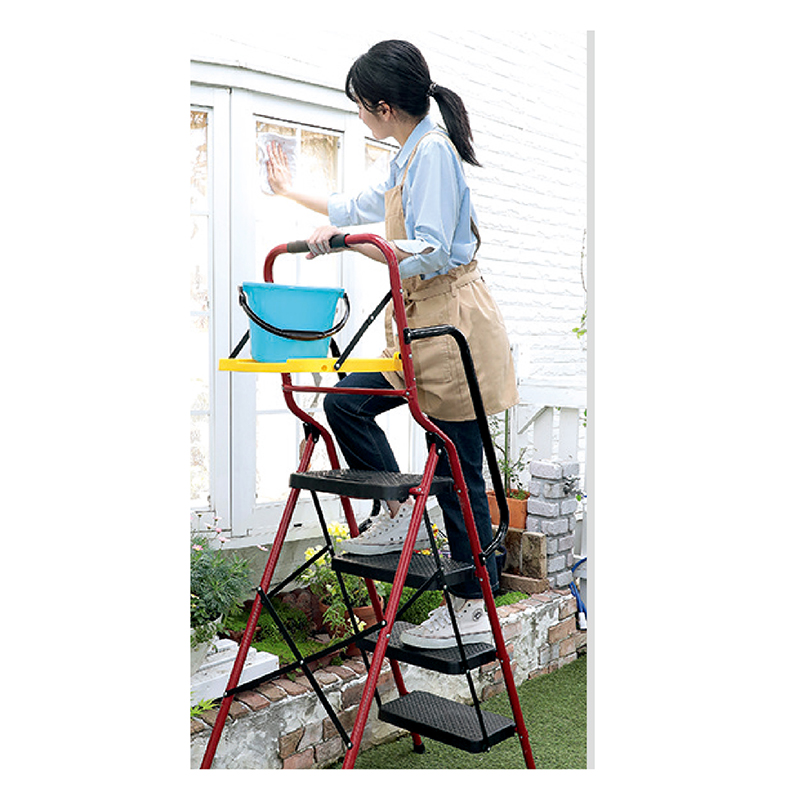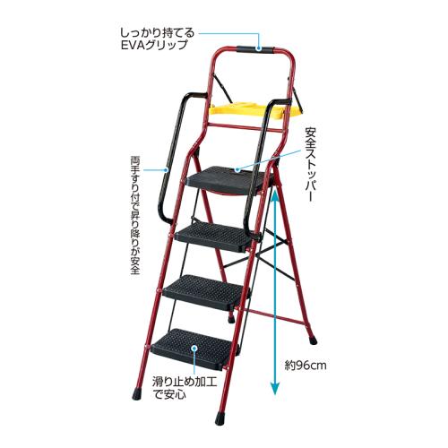 安心して昇り降り。作業効率もアップ。 昇り降りしやすい幅広ステップに、しっかり掴める両手すりが付いて高所の作業効率がさらにアップ。大型トレーは作業道具をおけて便利。薄く折りたためるので収納スペースもわずかです。 ●サイズ(外寸・約):幅54×奥行98×高さ155cm(4段目までの高さ96cm)/収納時=幅54×奥行24×高さ169cm ●重量(約):9.6kg ●耐荷重(約):ステップ(1段)=100kg/トレー=10kg ●材質:スチール、ポリプロピレン ●一部組立式 ●付属品:組立用六角スパナ ●中国製 ※組立には別途プラスドライバーをご用意ください。 ※お届けまで約2週間かかる場合があります。