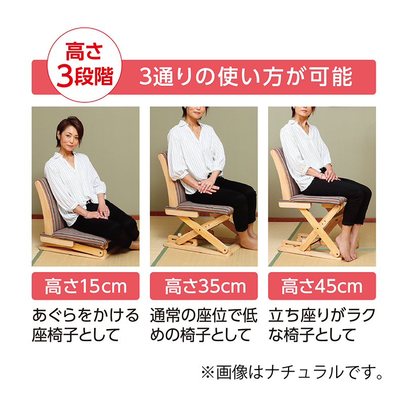 座る人やシーンに合わせて3段階に高さを変えられる座椅子。 椅子の高さが手軽に3段階に調節できるので、和室のちゃぶ台から洋室の食卓テーブルまで暮らしの様々なシーンに対応します。後ろに倒れにくく、フロアや畳なども傷めにくい安全設計です。 ●サイズ(約):幅44×奥行58.5×高さ53・73・83cm/座面高さ=15・35・45cm(3段階調節) ●重量(約):9kg ●耐荷重(約):90kg ●材質:脚部=天然木(ラバーウッド、ナチュラル=オイルステイン塗装/ブラック=ウレタン樹脂塗装)/張地=綿100%/中材=ウレタン ●完成品 ●日本製 ※下にマット等を敷いてご使用ください。 ※お届けまで約3週間かかる場合があります。