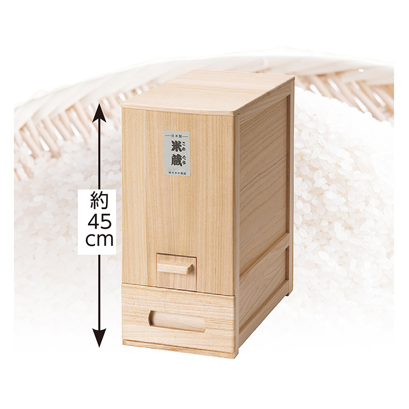 米どころ・富山の職人が作り上げた、総桐製米びつ。 桐材のもつ天然の防虫、調湿・調温効果で、お米を虫害や高温多湿から守ります。プラスチックや金具は一切使わないこだわり。つまみを引くたび、一合ずつ容器に落ちる計量機能付。お米を残らず取り出せる構造です。 ●サイズ(約):幅23×奥行43×高さ45cm ●重量(約):2.5kg ●材質: 天然木(桐) ●日本製 ※商品の性格上、一点一点風合い等が異なります。 ※お届けまで約3週間かかる場合があります。 ※ご使用後の返品・交換はお受けできません。