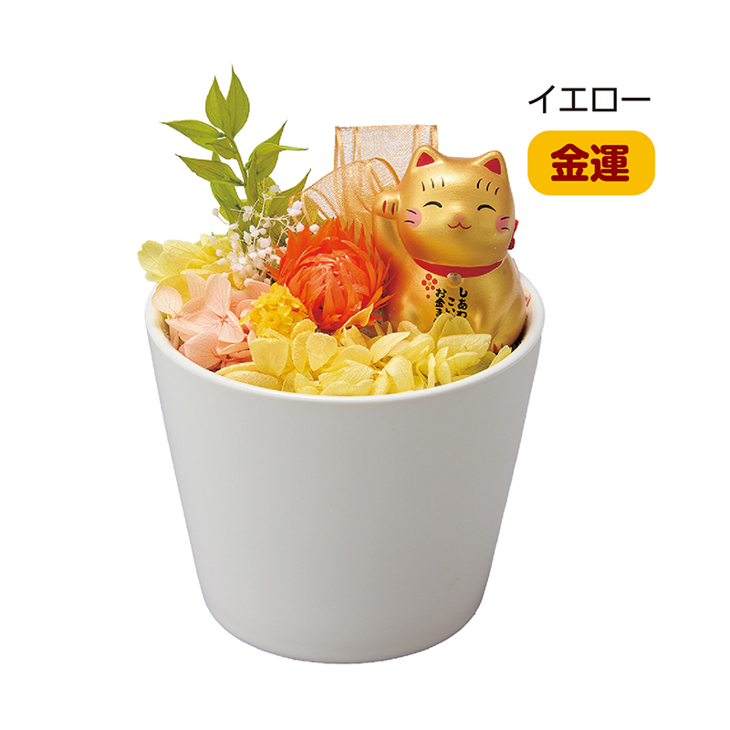 縁起物の招き猫とプリザーブドフラワーをかわいらしく美しくコーディネート。 招福の招き猫がプリザーブドフラワーの間にちょこんと座るかわいらしいインテリア。左手を挙げている猫は良縁や人間関係の円滑化を、右手を挙げている猫は金運や商売繁盛を願っています。 ●サイズ(約):幅8.5×奥行8.5×高さ13cm ●重量(約):260g ●材質:プリザーブドフラワー=あじさい、ラスカス、カスミソウ/ドライフラワー=スターフラワー、デイジー/陶磁器、他 ●日本製 ※天然素材かつ手作り品のため、色や形、大きさが多少異なる場合があります。 ※一部花材が変更になる場合があります。